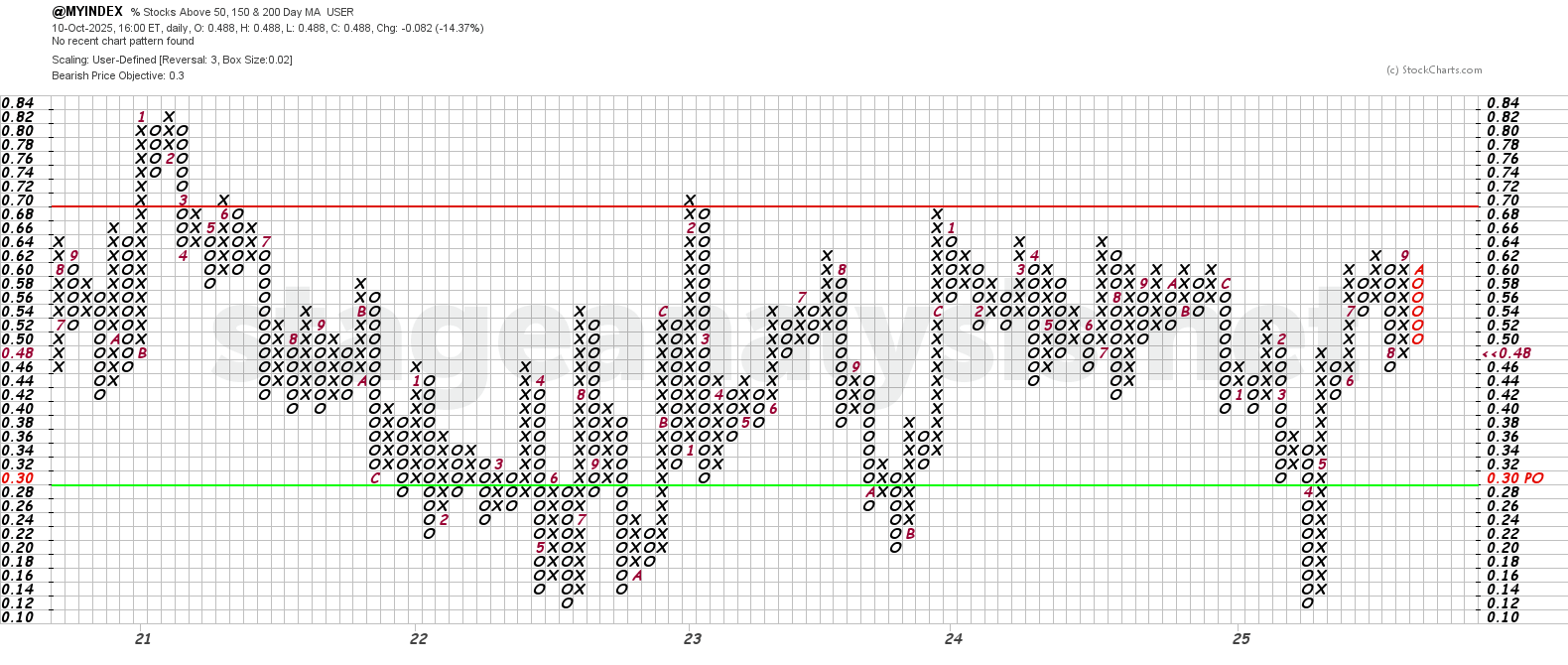 The Point and Figure (P&F) chart (shown above) reversed into a column of Os on Friday, dropping 6 boxes (over -12%). So the P&F strategy changed to Defense (as it is in a column of Os), and P&F Bear Confirmed status in the middle of the field.