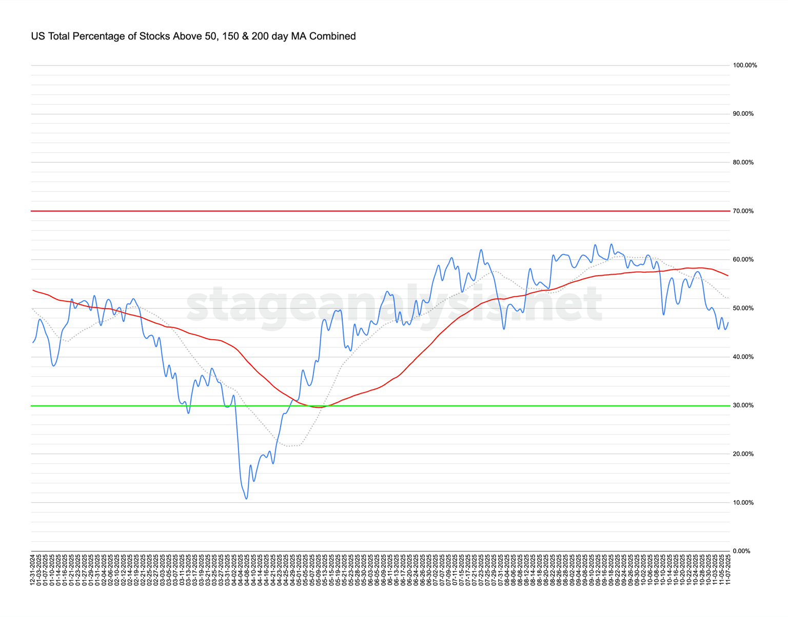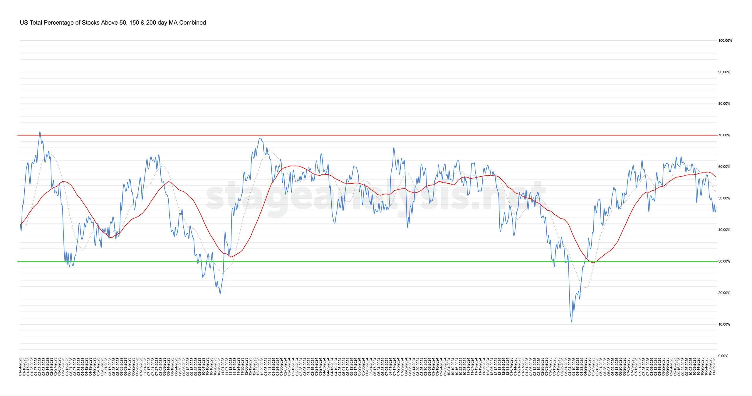 Market Breadth: Percentage of Stocks Above their 50 Day, 150 Day & 200 Day Moving Averages Combined