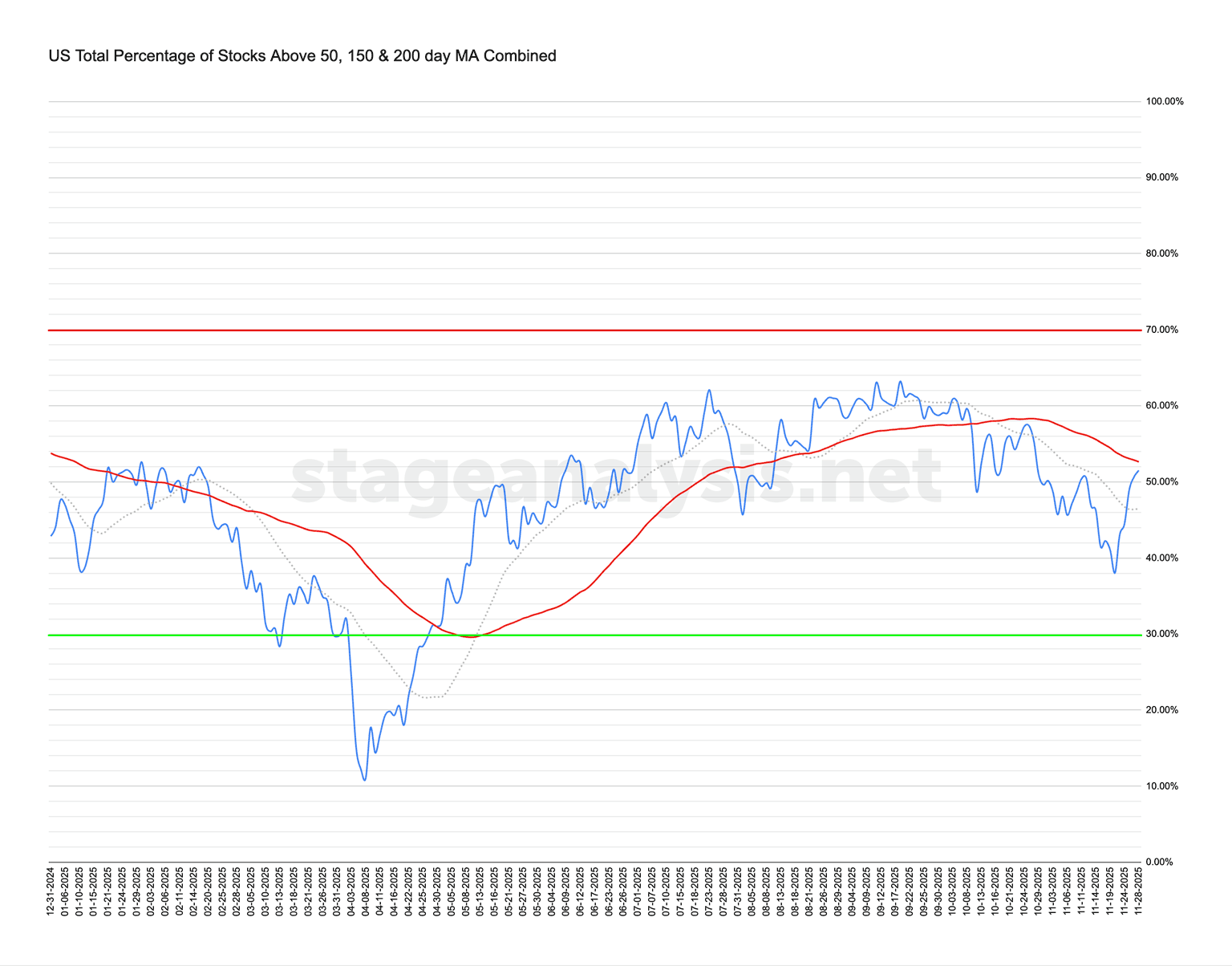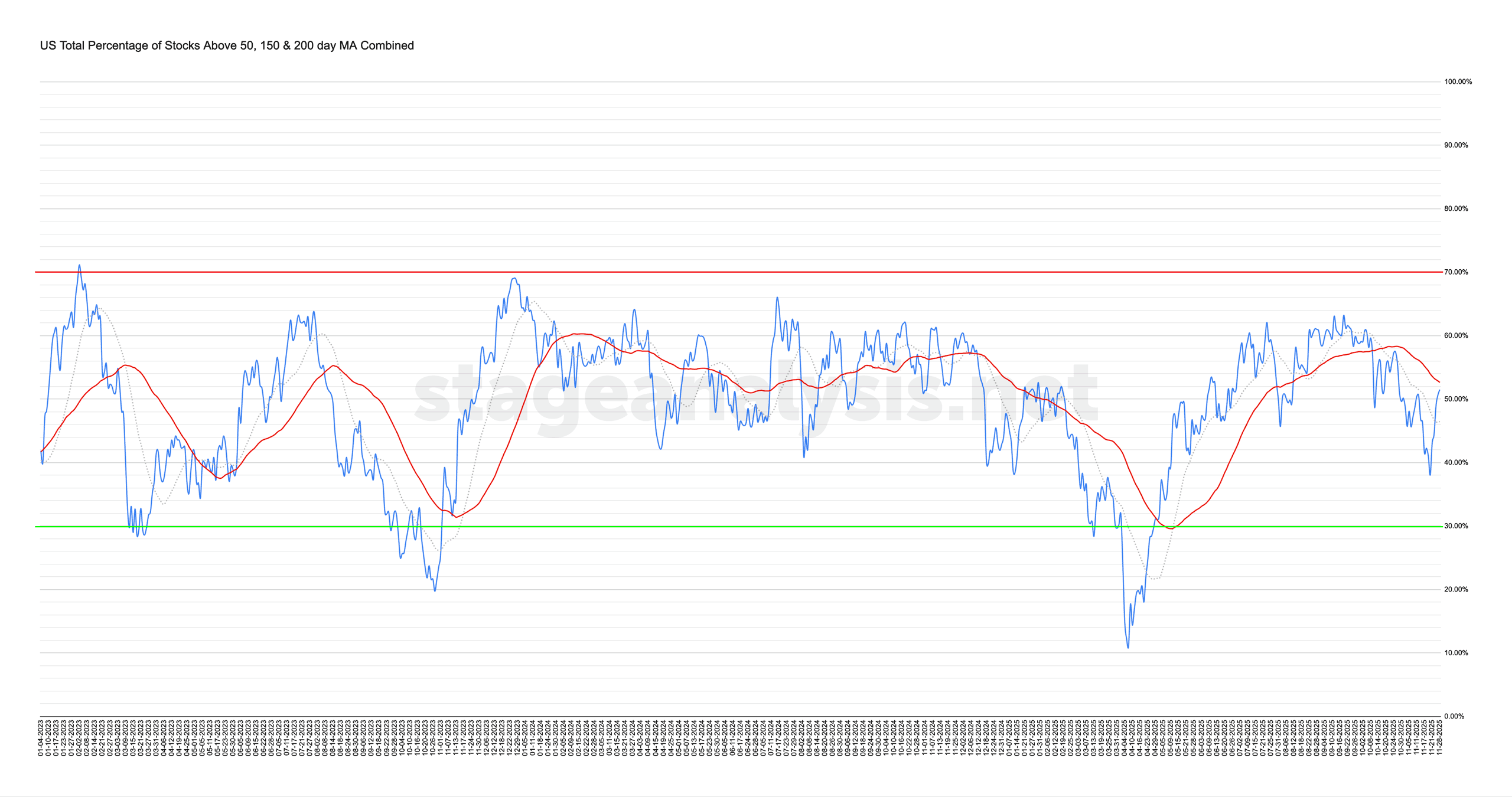 Market Breadth: Percentage of Stocks Above their 50 Day, 150 Day & 200 Day Moving Averages Combined