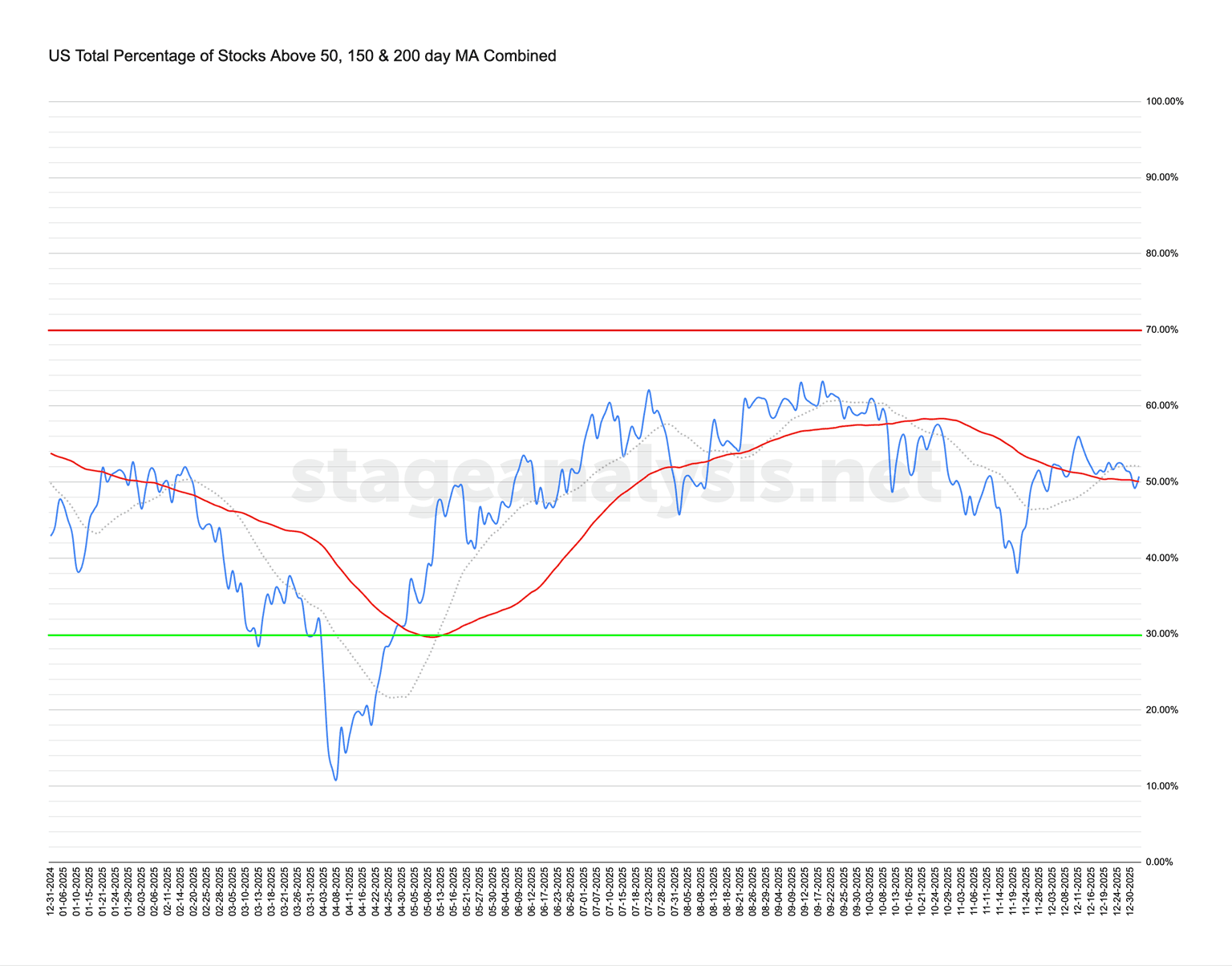 Market Breadth: Percentage of Stocks Above their 50 Day, 150 Day & 200 Day Moving Averages Combined