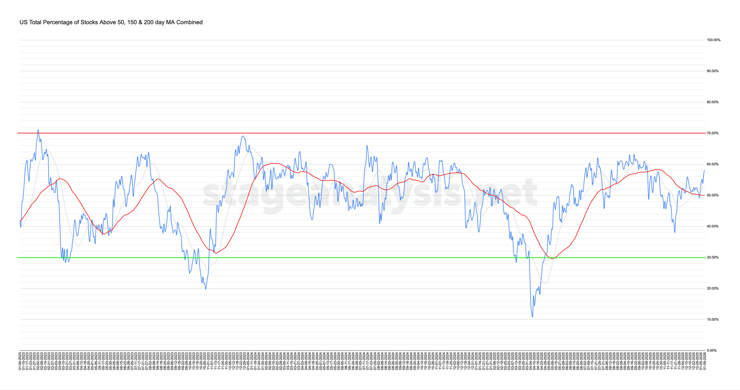 Market Breadth: Percentage of Stocks Above their 50 Day, 150 Day & 200 Day Moving Averages Combined