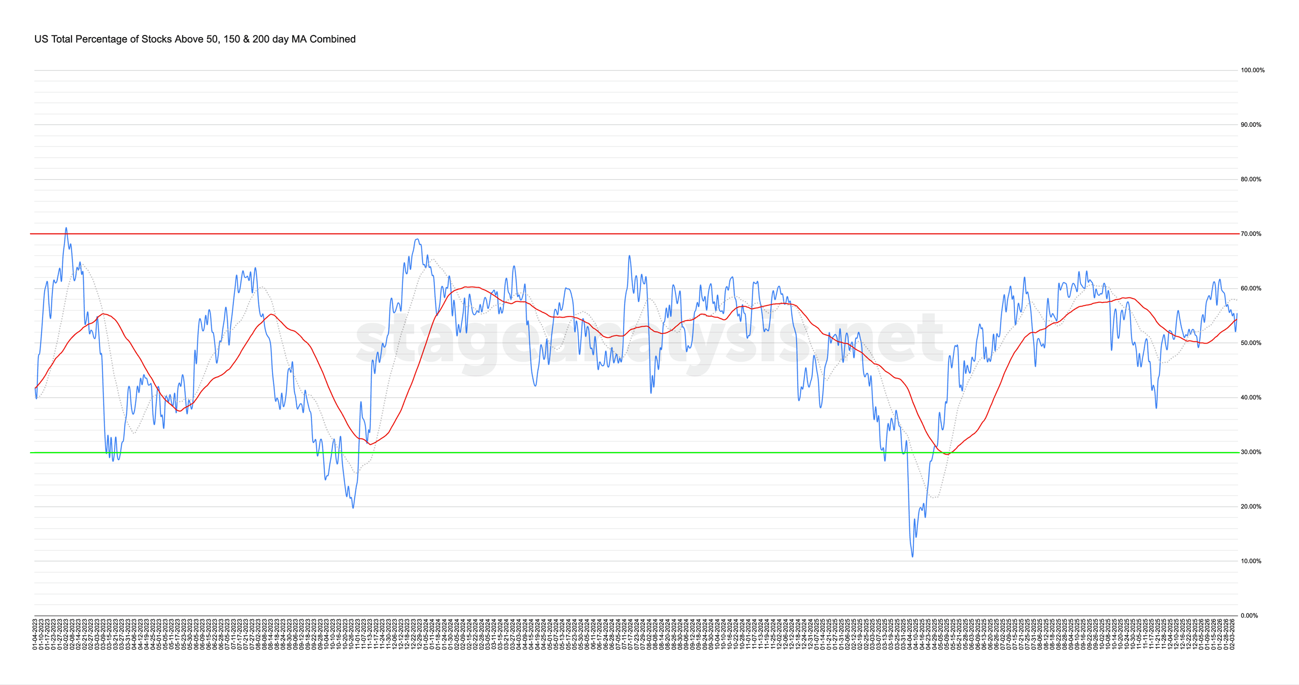 Market Breadth: Percentage of Stocks Above their 50 Day, 150 Day & 200 Day Moving Averages Combined