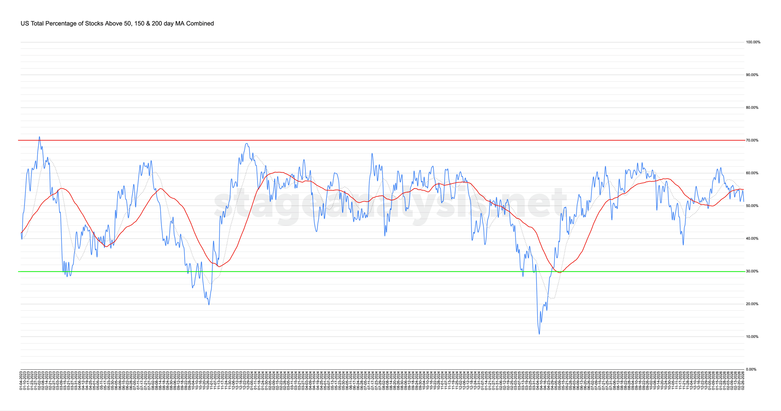 Market Breadth: Percentage of Stocks Above their 50 Day, 150 Day & 200 Day Moving Averages Combined