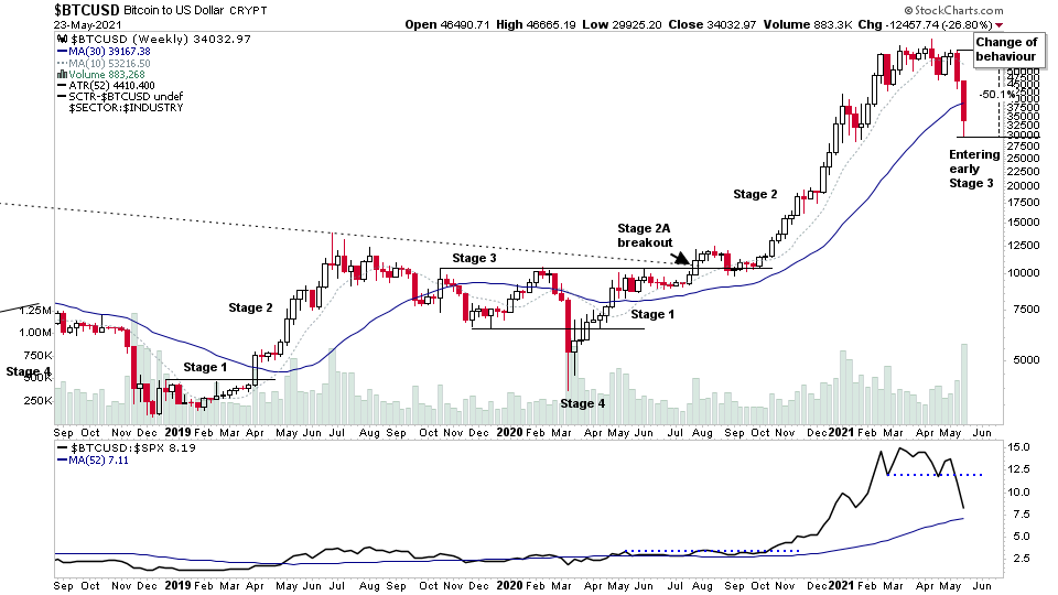 Bitcoin has moved into early Stage 3 on the weekly chart this week with a sharp change of behaviour. On the shorter term daily chart it entered a daily Stage 4A decline which I highlighted on the twitter feed during the week, after it failed to bounce / hold support at the bottom of the range.