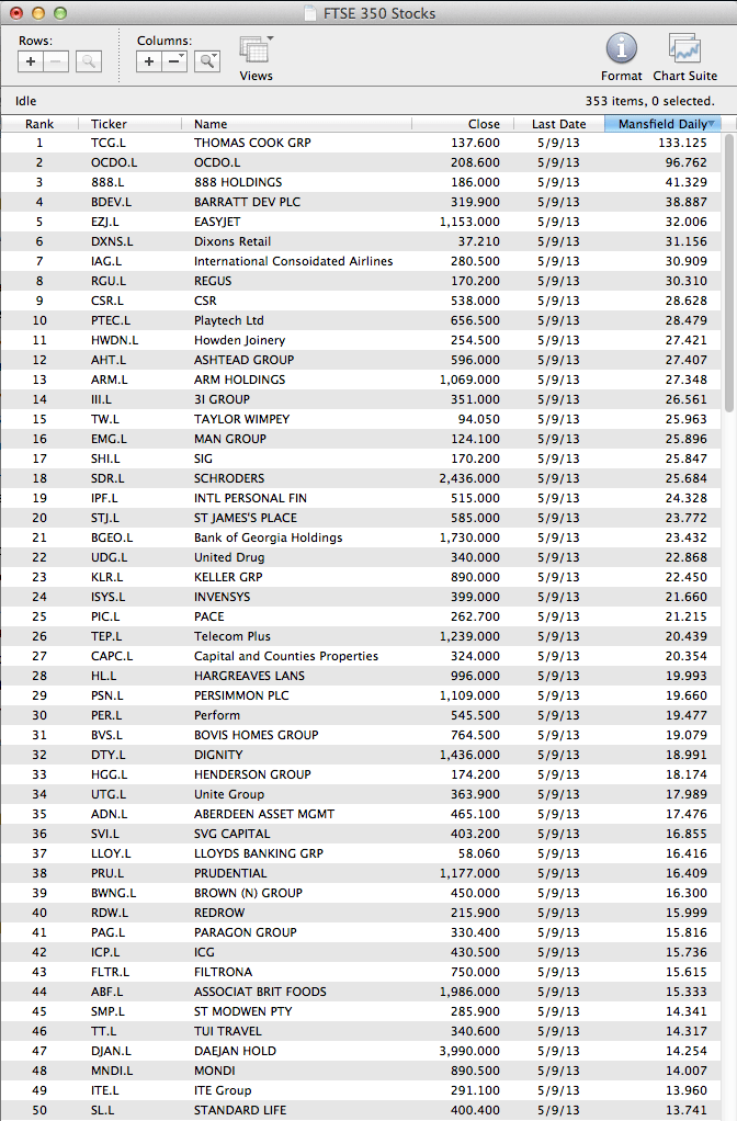Fate does not always let you fix the tuition fee. She delivers the educational wallop and presents her own bill - Reminiscences of a Stock Operator. RE: Introduce yourself here!(2013-05-09, 09:25 PM)isatrader Wrote:(2013-05-09, 08:35 PM)bluemosaic Wrote: isatrader - what software are you using for your tables of relative strengths and charts - is it pro real time? Great-I am more interested in UK shares so sector and share commentary would be of interest. Am happy to start contributing screenshots/analysis. I currently use sharescope gold which I really like. This provides sectors but I cannot write custom indicators - need plus version for that. Please let me know thoughts on above analysis. RE: Introduce yourself here!(2013-05-09, 10:00 PM)bluemosaic Wrote: Great-I am more interested in UK shares so sector and share commentary would be of interest. Am happy to start contributing screenshots/analysis. I currently use sharescope gold which I really like. This provides sectors but I cannot write custom indicators - need plus version for that. Please let me know thoughts on above analysis. That's good to hear, as one of my main aims for the site is to bring people to together that have the same focus and follow Weinstein's method and want collaborate on finding stocks, etfs etc that meet the methods key requirements. I will be interested to see what the sharescope charts are like, and let me know if you have questions about the proper set up. As I know you're interested in UK stocks, attached is the latest relative performance table for the FTSE 350 stocks. I've only done the top 50 ranking stocks, as that should give you a good starting point.