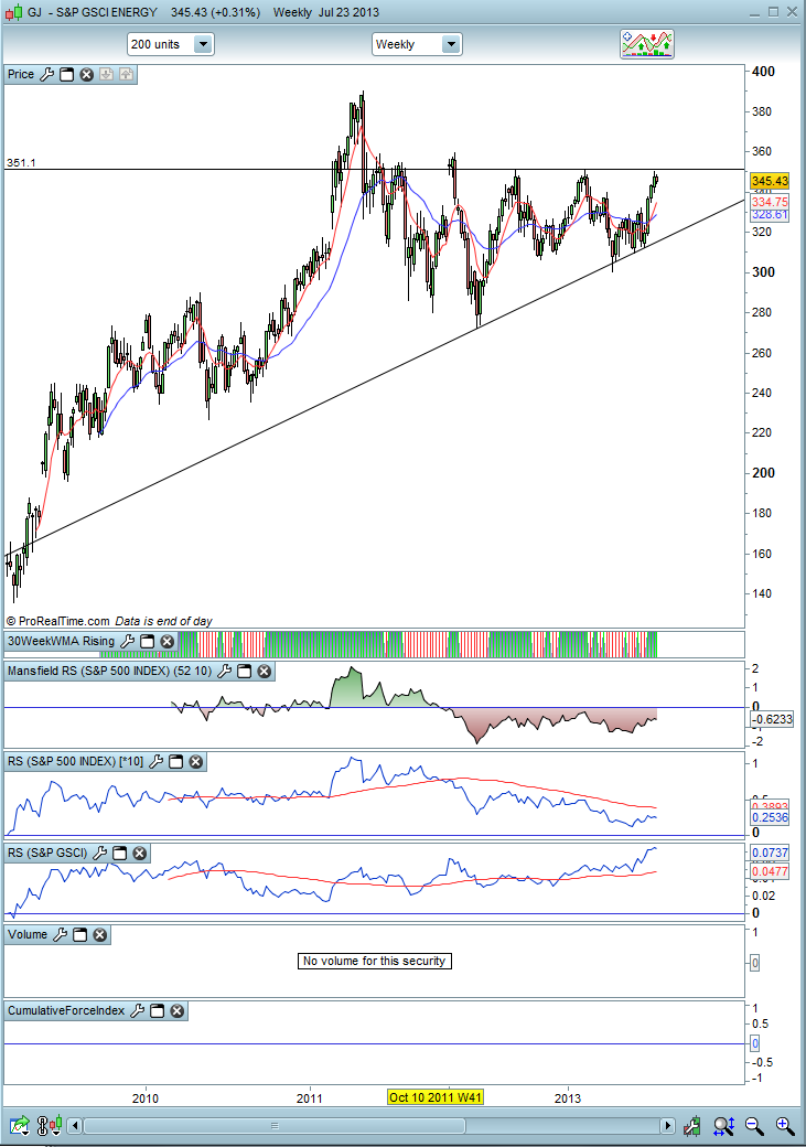 Should we look closer at the Energy commodity sector we see a Stage 1(?) breakout pattern unfolding. The negatives are that there is potential resistance at 390 after the initial breakout of 351 and that the SP500 relative strength is still negative but sloping up. relative strength to GSCI is positive as can be seen on the prefchart.