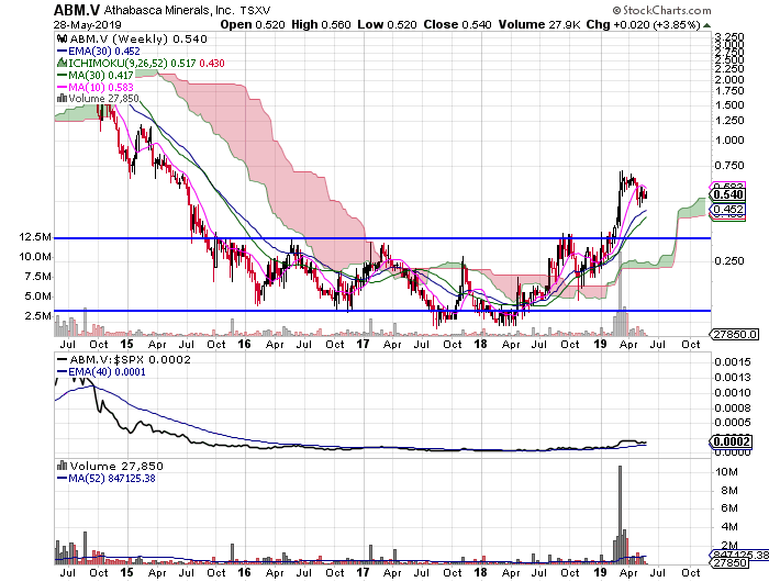 Can you please comment on ABM.V (attached). It has based for a couple of years and finally broken out recently on huge  volume. The proper buy point was around 32 cents on the breakout I believe but I am wondering  if it is in buy territory right now or maybe best to wait and hope it gets closer to the 30 ema (it is about 20% above the 30 ema currently).