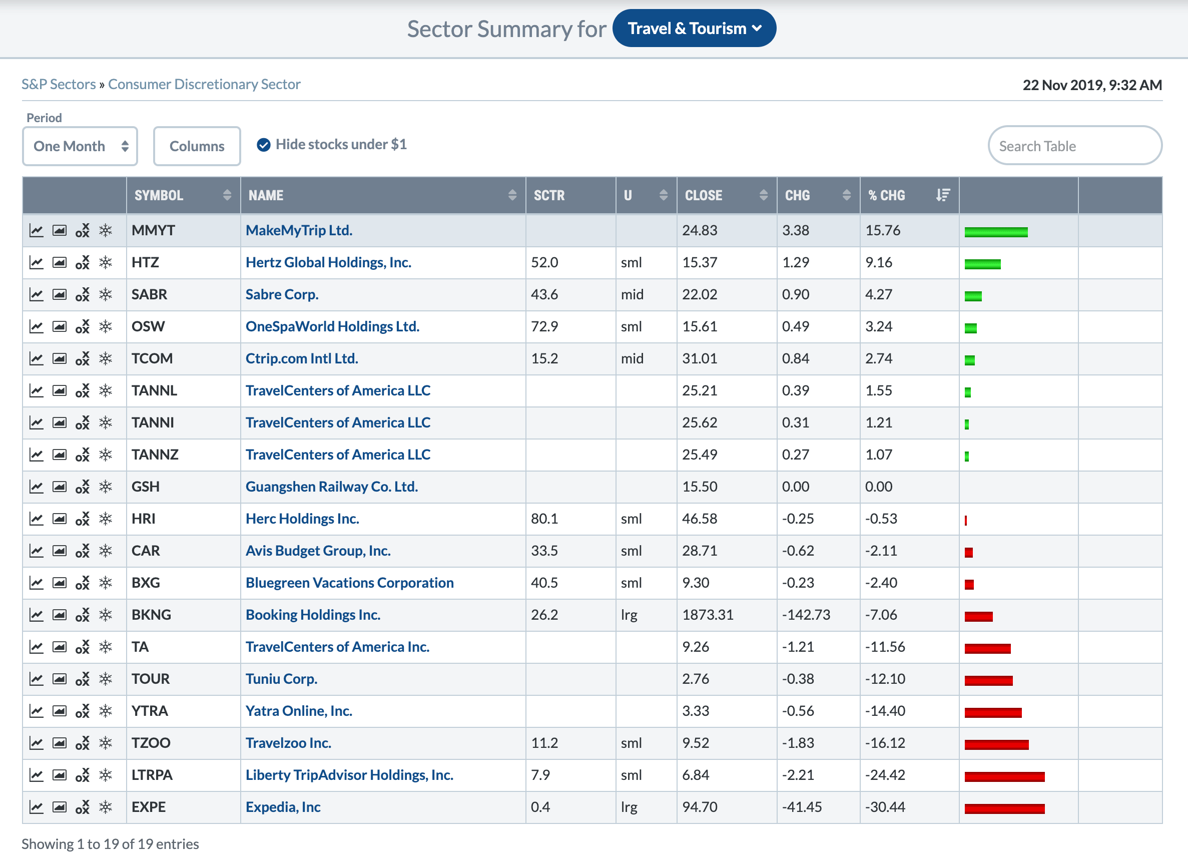 This has drop down options to change between the day, week, month, three month etc. So that you can see which sectors are performing the best over different time periods. Then if you click on the name of the sector it will take you to another page that has all of the stocks listed in that sector, and you can change the time period again and see which of those are performing the best over different time periods. For example attached is the Travel and Tourism Sub Sectors stocks performance over the last month.