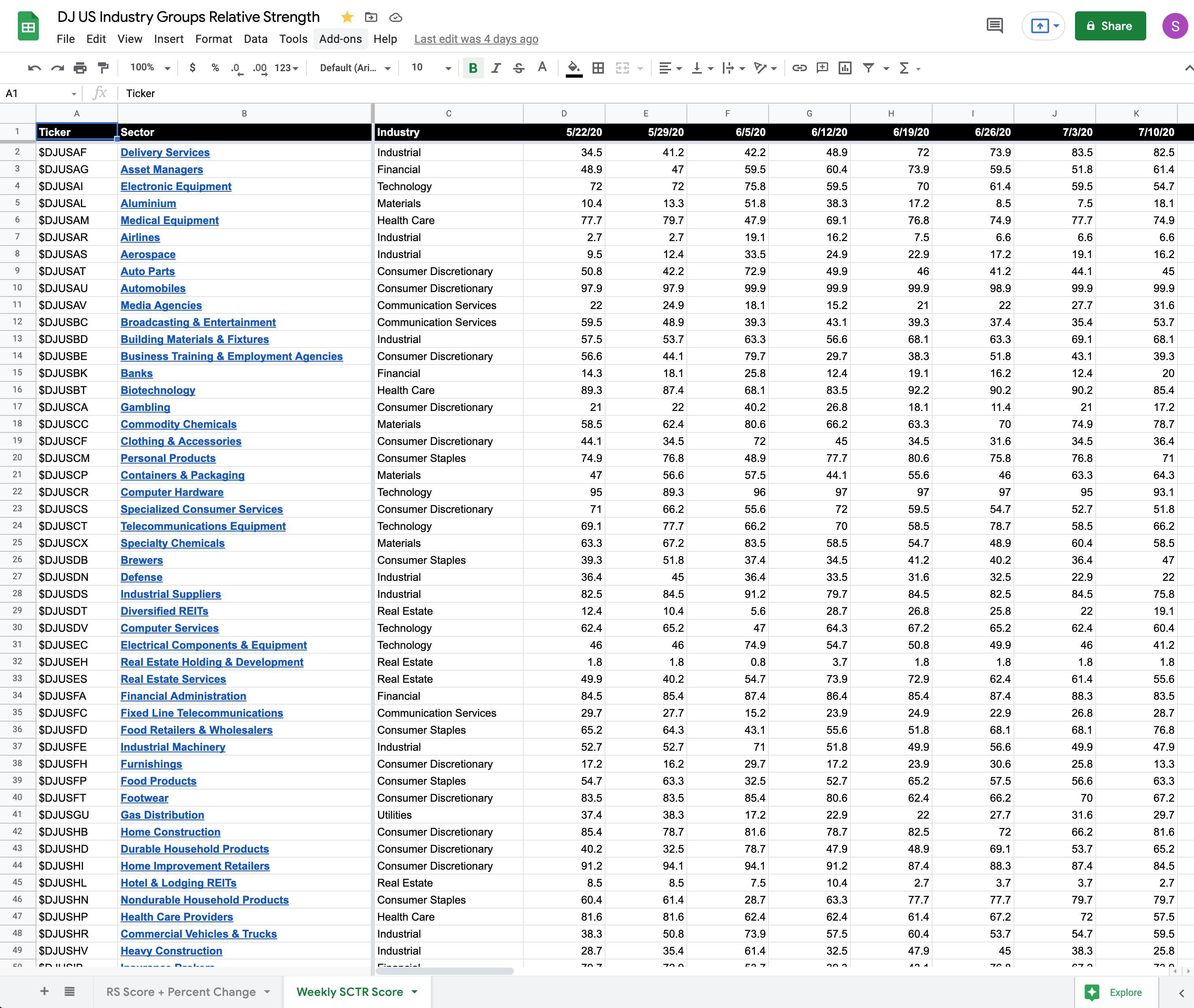 I am wondering how you calculate the RS of the industry groups in your Google Sheet Table (you name it "RS Score"). I guess, it is not the SCTR score from stockcharts.com, is it? If it is, how do you import the SCTR into Google Sheets? If it is NOT, do you mind to tell us, how you calculate the RS score?