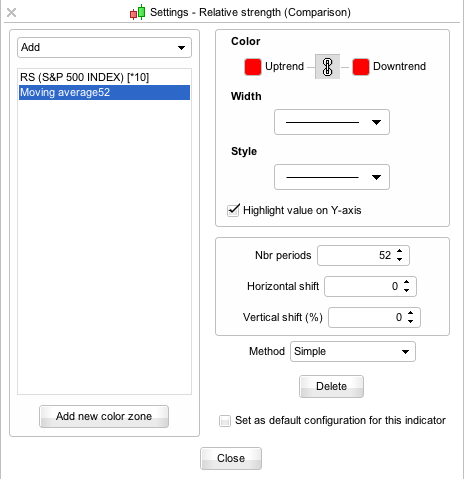 Add the indicator and set the settings to compare against the set it against the S&P 500 Index and add a 52 week moving average.
