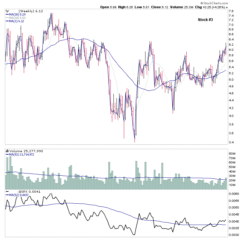 Chart #2 was Navios Maritime (NM) in March 2013, which was making a solid Stage 2A breakout, with more than 2x the average volume and relative performance moving above a flat zero line which it had hugged for a while.
