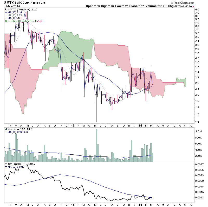Malcolm, asked whether the initial breakout was the one before the end of November last year, but that breakout would only be considered a breakout within Stage 1, as SMTX was still trading below a lot of near term resistance at the time, and there wasn't much of a base to speak of, and so in this case it's formed a higher Stage 1 base which often happens in stocks with a lot of near term resistance, as they need time to work off the supply. Attached is the weekly chart again, but with the ichimoku resistance cloud overlaid, so you can visualize the potential resistance area.