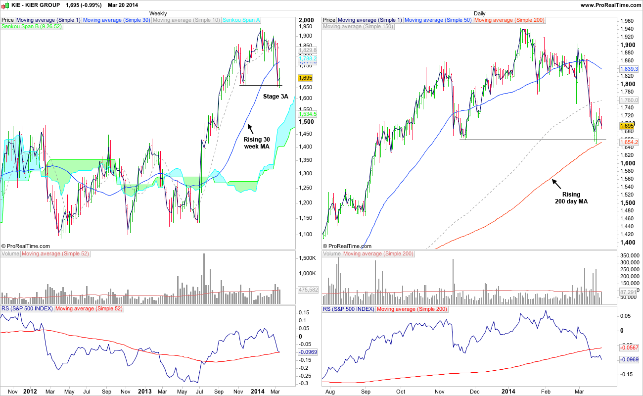 (2014-03-20, 08:52 PM)pcabc Wrote: Anyway, question about stops. I'm an investor. Keir (KIE.L) is currently below the MA30 and the recent minimum of 1681 is close to the previous minimum of 1670. The book states that it is OK for the price to drop below MA30 provided it is higher than the previous minimum and the MA30 is rising. Ref page 189.