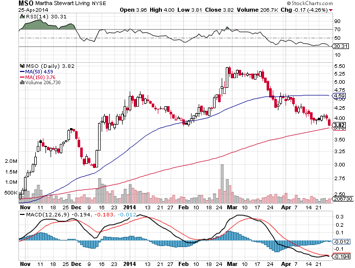 (2014-04-27, 06:06 PM)Tom Wrote: First one is MSO. I purchased MSO at 3.58 on 2013-12-02 and sold half of the positions at 4.76 Feb 25th since there was resistance from two years ago. Later MSO reached 2 year high on March 3rd then dropped to 3.8 now which is closed to its 30 weeks MA. I am thinking of repurchasing it back if the volume and price go up for 2,3 days. What's your thoughts? and What would you handle the other half position differently as a trader or investor?