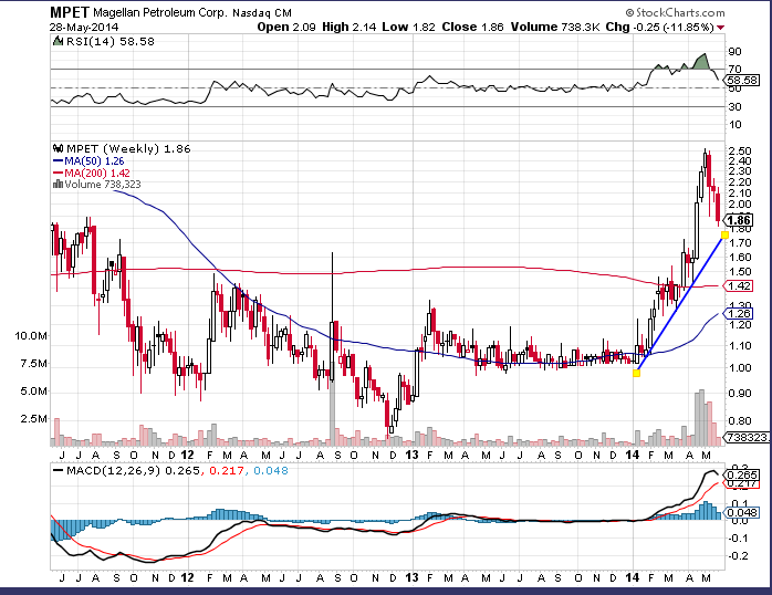 I am holding MPET from Nasdaq. It has a two year stage 1 base and I purchased it when it broke out in Feb. Sold half of position during the peak time - my reason is that the support range was around 2.5 - 2.27 from Jan, 2011.