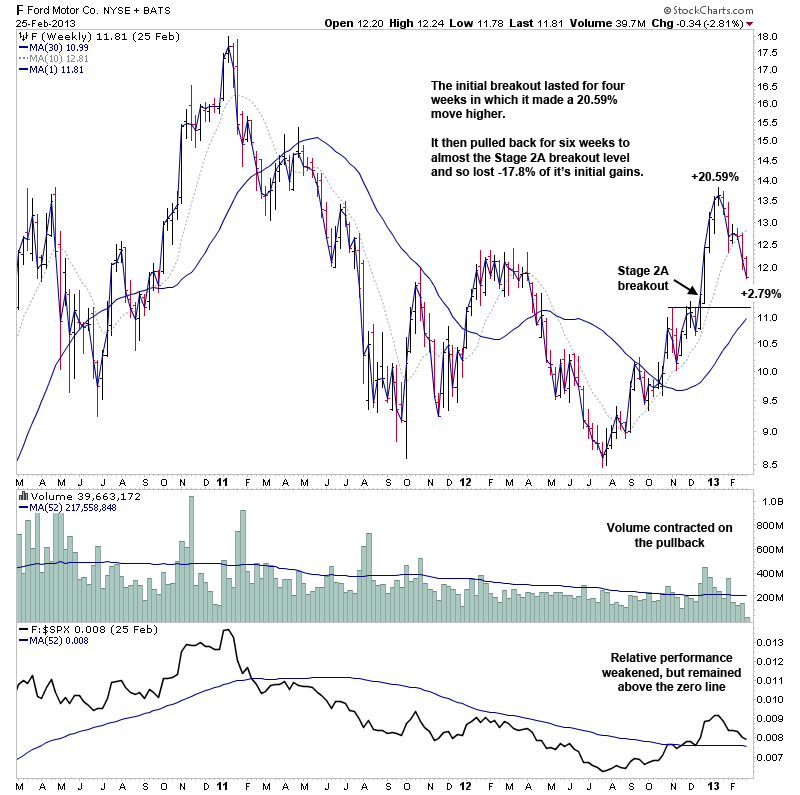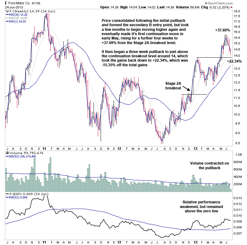It's hard to sit through an entire Stage 2 advance, as there are usually a number of significant pullbacks towards the 30 week moving average which try to shake people out of the stock. The following is a breakdown of Fords entire Stage 2 advance from late 2012 until the end of 2013 and I've shown the weekly chart at the lows of each significant pullback, so that you can see what it looks like and what the percentage moves were in this case on each pullback. As holding through the pullbacks is a necessary part of the investor method in order to capture the bulk of the Stage 2 move, but some people find it hard in practice as you often see gains that took months to accumulate wiped out, before it once again moves higher.