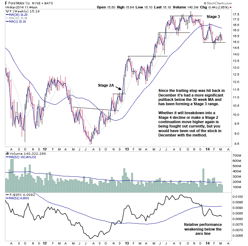 In December 2012 Ford (F) made it's Stage 2A breakout following a small head and shoulders bottom through the summer months, and then a brief Stage 1 consolidation in the Autumn above it's 30 week MA before breaking out on increasing volume in December.