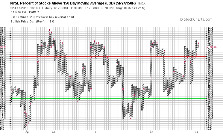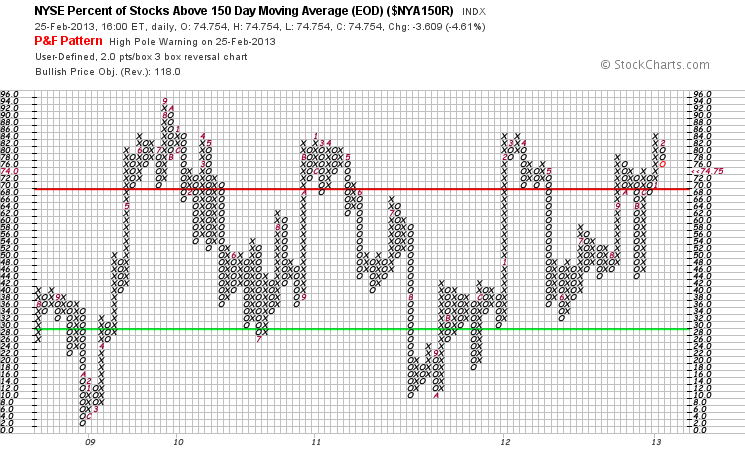 The medium term NYSE Percentage of Stocks above their 150 day Moving Averages chart added an additional O today, which means it's dropped below 50% of the previous column of Xs, and hence given a P&F High Pole warning. So the status changes from Bull Correction to Bear Alert now for the medium term moving average breadth chart.