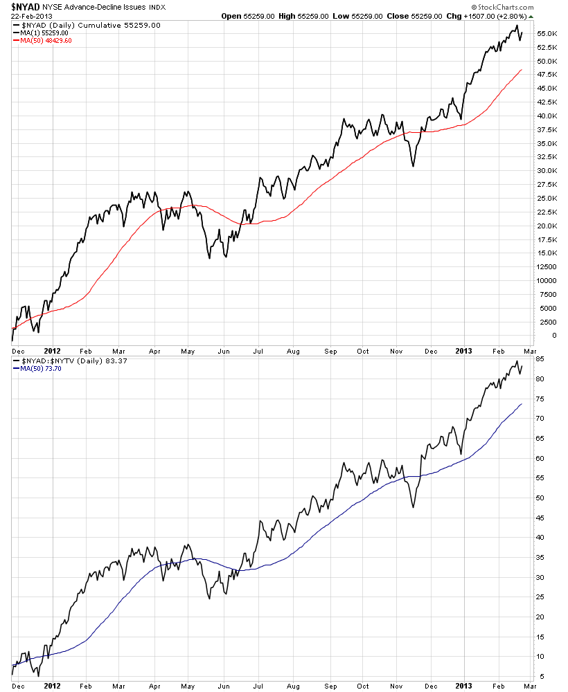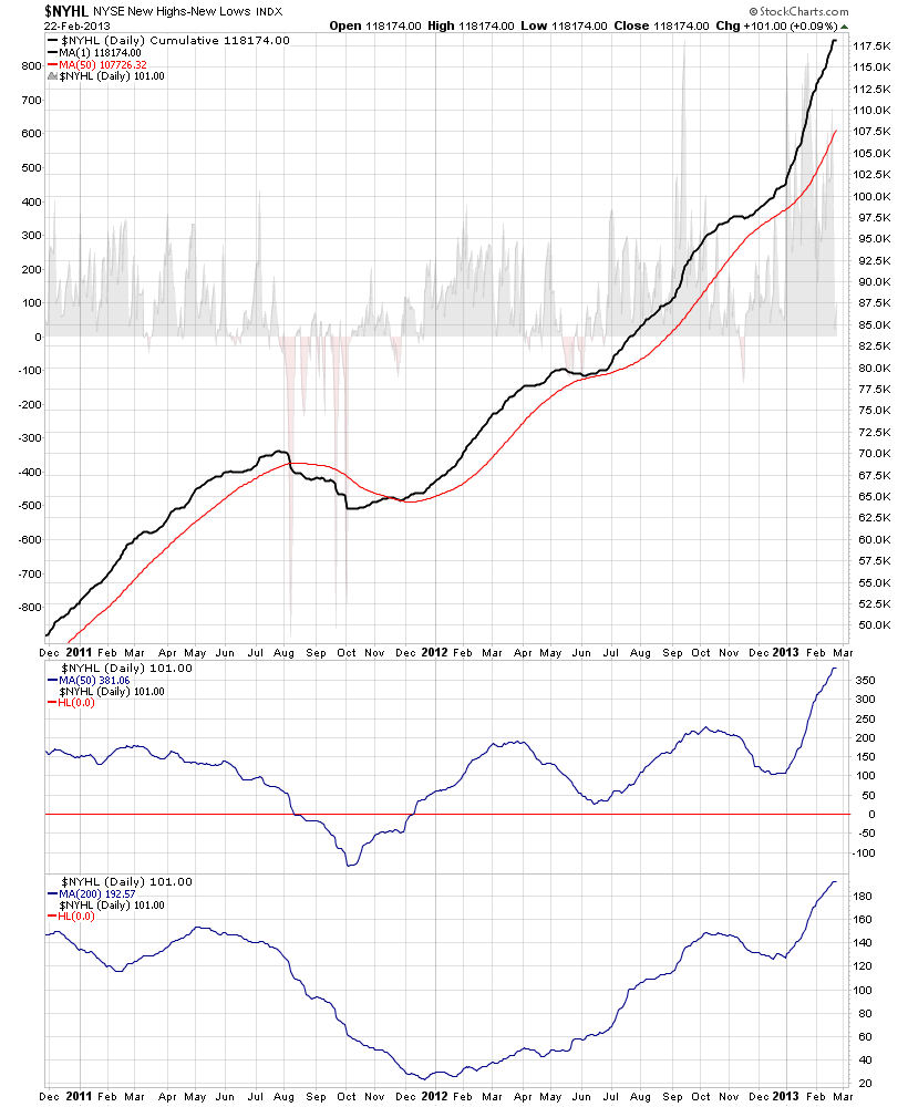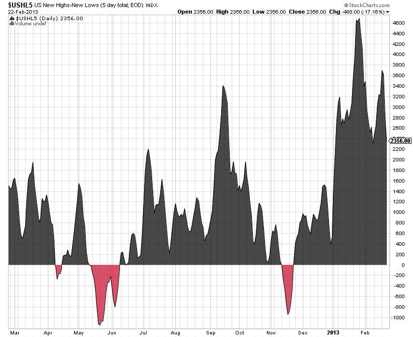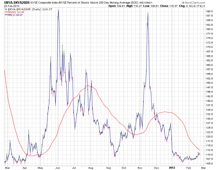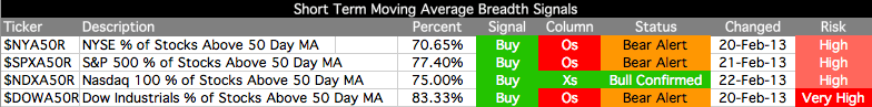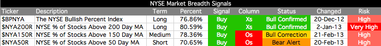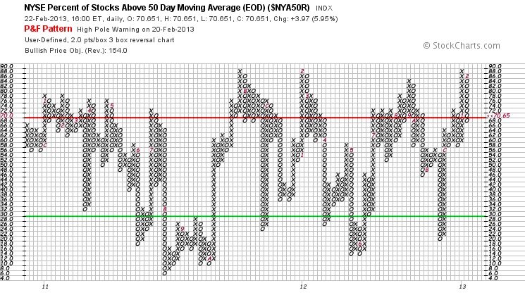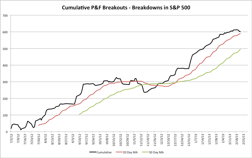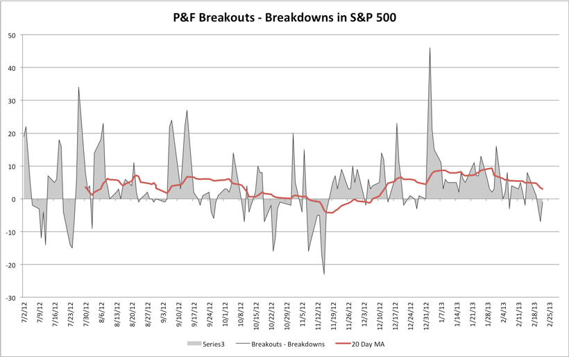 • Cumulative P&F Breakouts - Breakdowns had it's first negative of the year with only 6 breakouts to 16 breakdowns. So -10 for the week, which has taken it 11.6 from it's 20 day MA which I use as a signal/action line, and it's been above since late November 2012.
