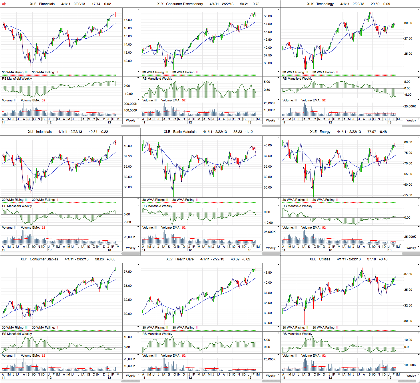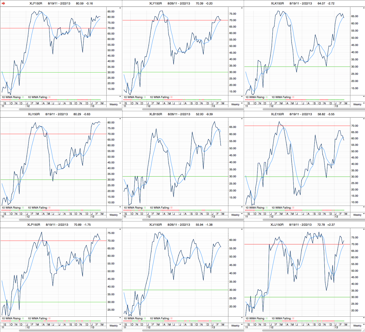 There was numerous changes this week for the first time this year with four more sectors moving below their 10 week MAs. Consumer Staples, Technology, Energy, Health Care all move to a sell signal and so the market is very mixed with four sectors still green and five now red.