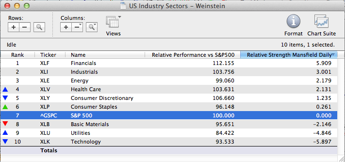 Attached is the the weekly and daily charts of the major sectors and below is the relative performance table in order of strength. Notable changes this week were the crosses above and below the zero line for Consumer Staples (XLP) and Basic Materials (XLB) and the move off the bottom stop for Utilities (XLU). Health Care (XLV) also moved up and so the three defensive sectors showed the best relative performance which is unsurprising considering the volatile week in the US market.