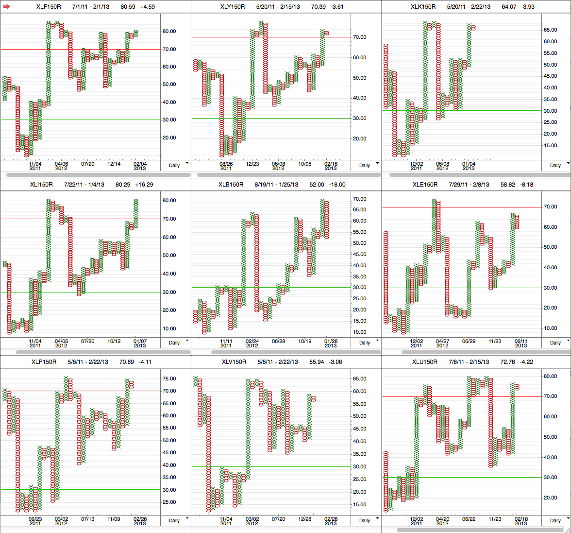 Below is the data table for the Percent of Stocks Above 150 Day Moving Average in each sector which I've ordered by relative strength, with the highest to the lowest percentage in each sector. Also attached is the visual diagram of the 9 sectors and the overall NYSE Percentage of Stocks above their 150 day Moving Averages, plus the 1% P&F chart and line chart of the nine sectors.