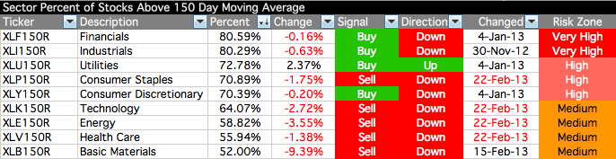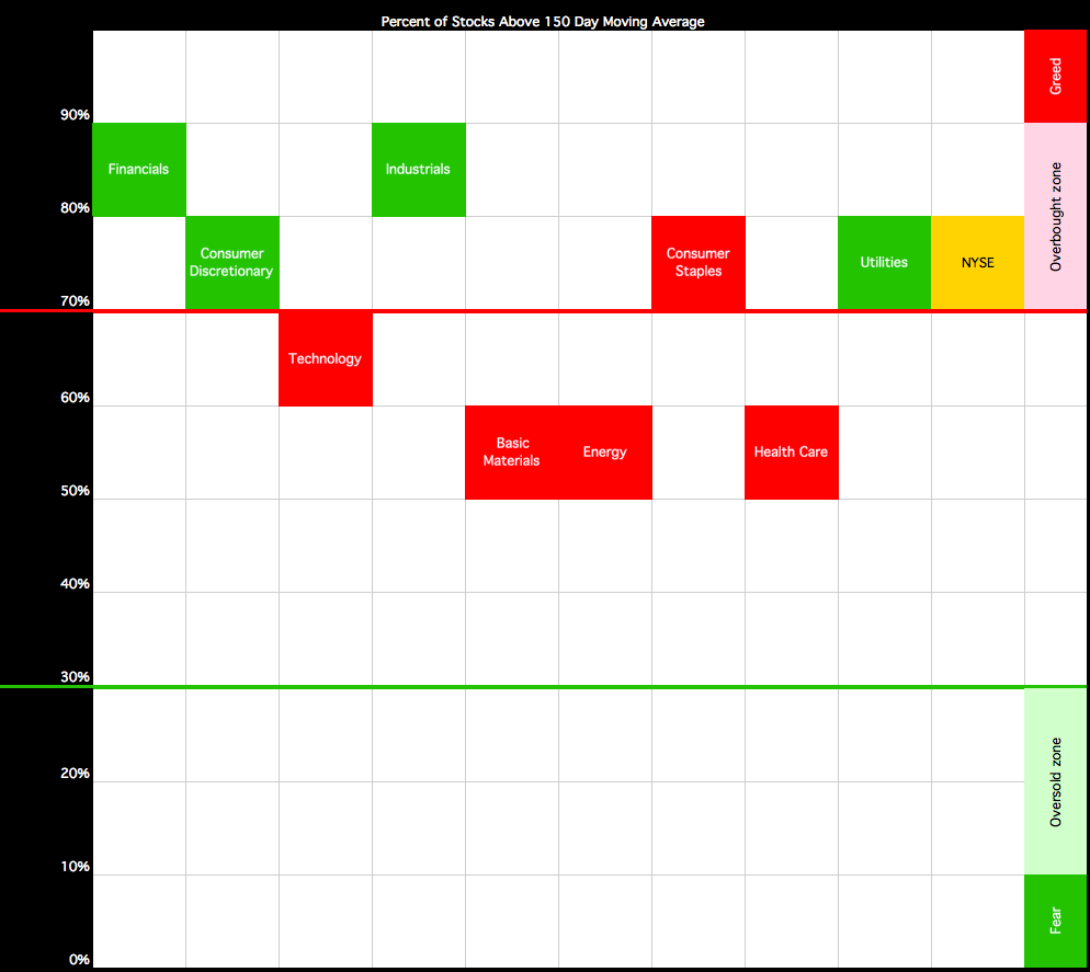 Financials and Industrials remain the strongest sectors with over 80% of their stocks above their 150 day moving averages whereas Health Care and Basic Materials are the weakest sectors with only 55.94% and 52% of their stocks above their 150 day moving averages.