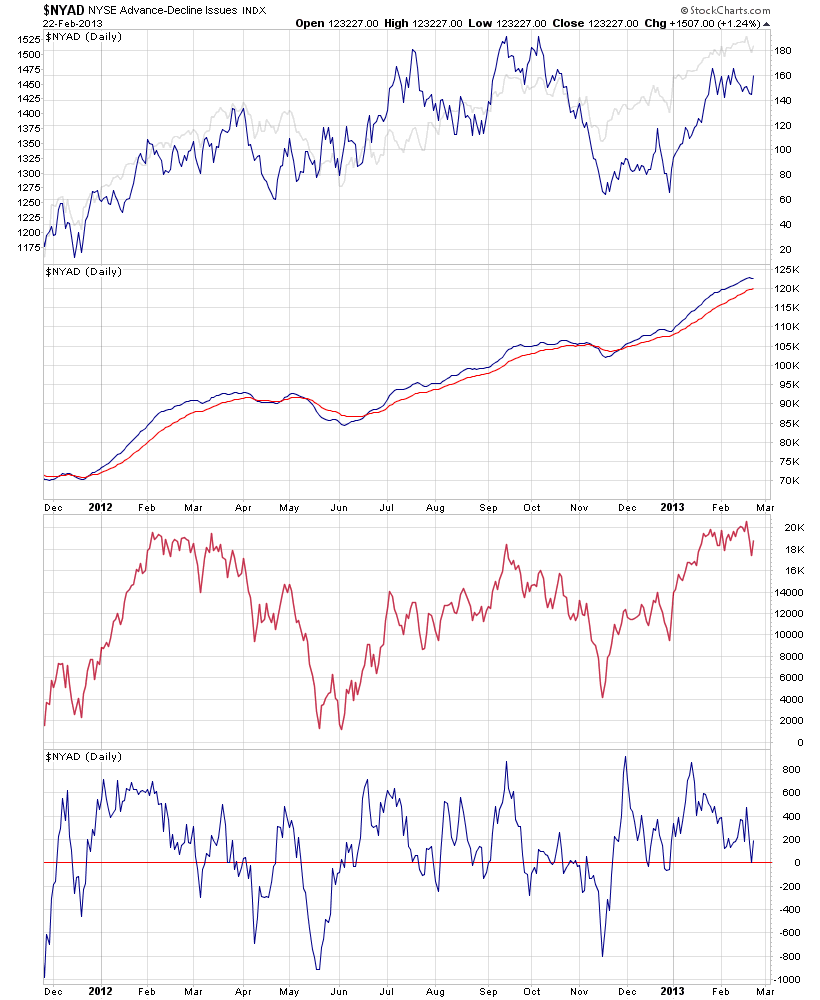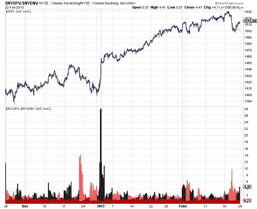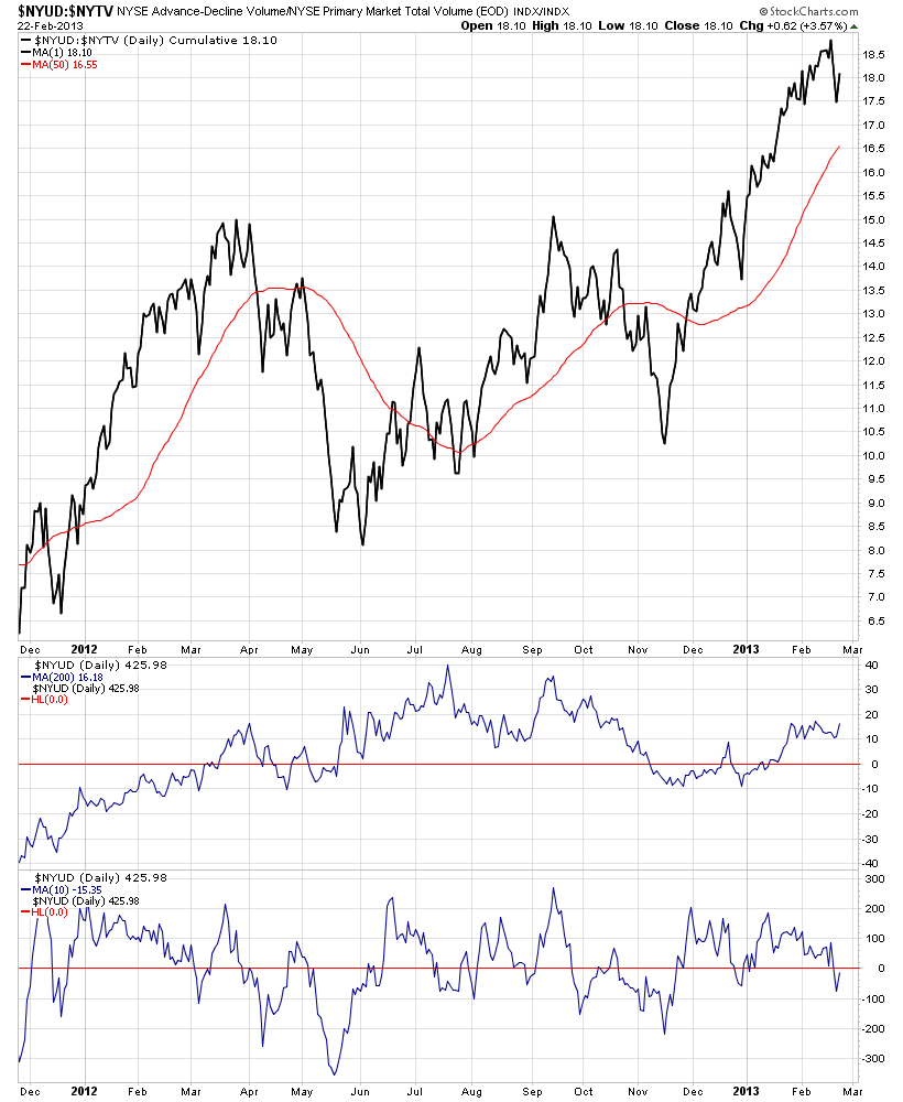 • The NYSE Volume Advancing / Volume Declining Ratio had a spike in declining volume mid week, but Friday's advancing volume was fairly strong also and so is a mixed still imo.