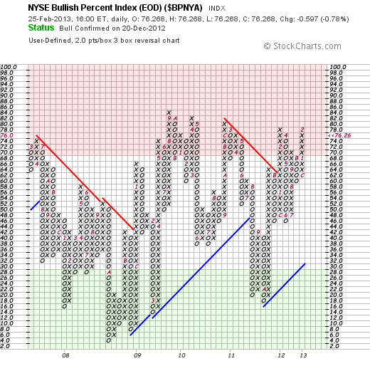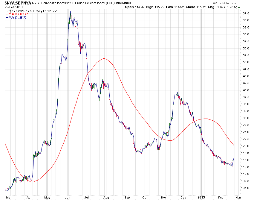 The $BPNYA is a compilation of the percent of stocks that trade on the NYSE that are on Point and Figure buy signals and tells you whether to be offensive or defensive with your strategy. And it also takes a lot to move the NYSE Bullish Percent Index because of the large amount of stocks in it, which is why it's used as a long term gauge of risk and not a so much as a timing measure.