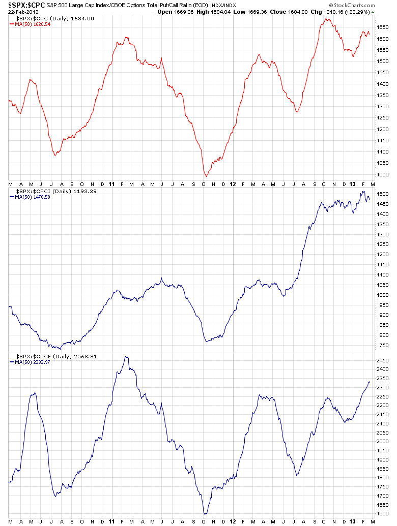 • The Put/Call ratio closed the week in bearish territory, and the $SPX/$CPC ratio has gone flat.