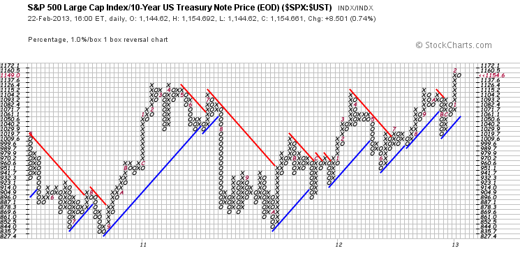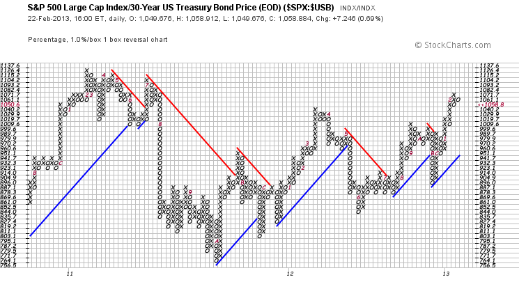 • The S&P 500 to US Treasuries ratio 1% reversal P&F charts both reversed to a column of Os.