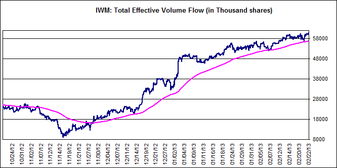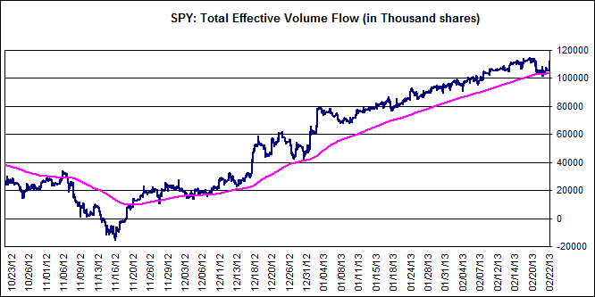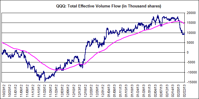 • And finally the effective volume charts - The QQQ is now on a sell signal as it's dropped below it's 20 day MA and the February lows, whereas the SPY and IWM both rebounded at their 20 day MAs, and are at or close to new highs still - and so are still positive.
