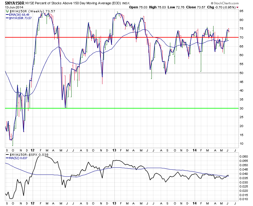 (2014-06-09, 07:58 AM)isatrader Wrote: Below is the data table for the Percent of Stocks Above 150 Day Moving Average in each sector which I've ordered by relative strength, with the highest to the lowest percentage in each sector. Also attached is the visual diagram of the 9 sectors and the NYSE Percentage of Stocks above their 150 day Moving Averages line chart.