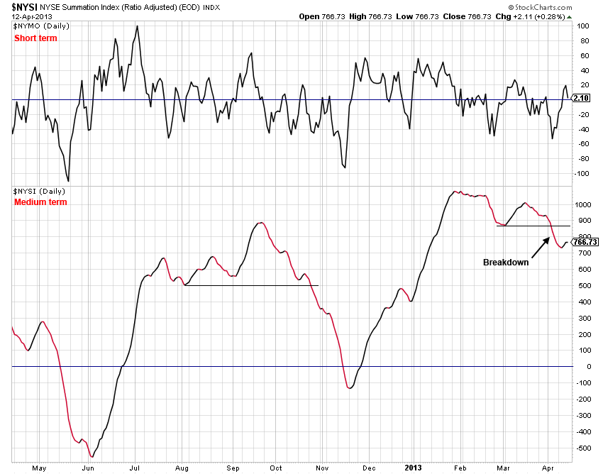 I'm adding an additional breadth indicator to the weekly watchlist, which is the McClellan Oscillator and Summation Index charts. Currently the McClellan Oscillator has pulled back to neutral territory near the zero line, but the McClellan Summation Index broke down over the last week following a lower high in March, and so is diverging from the NYSE price action.
