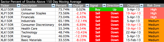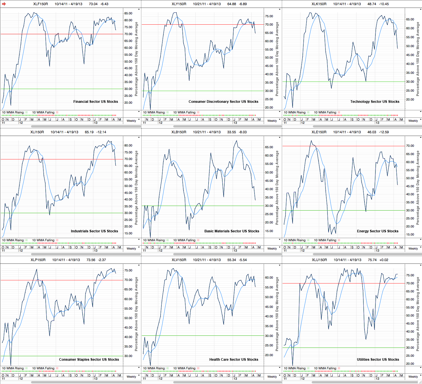 Below is the data table for the Percent of Stocks Above 150 Day Moving Average in each sector which I've ordered by relative strength, with the highest to the lowest percentage in each sector. Also attached is the visual diagram of the 9 sectors and the overall NYSE Percentage of Stocks above their 150 day Moving Averages, plus the 1% P&F chart and line chart of the nine sectors.