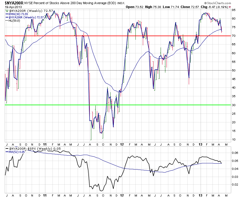 As I highlighted earlier in the week there have been some major changes to be aware of in the NYSE Bullish Percent Index and the Moving Average Breadth charts, starting with the long term NYSE Bullish Percent Index, which reversed this week to a column of Os and hence moved to a defensive posture within the high risk zone at the top of the chart. The longer term NYSE Percentage of Stocks above their 200 day Moving Averages also moved lower this week to give a high pole warning on the 15th April, which imo moves it to Bear Alert status just above the key 70% level.