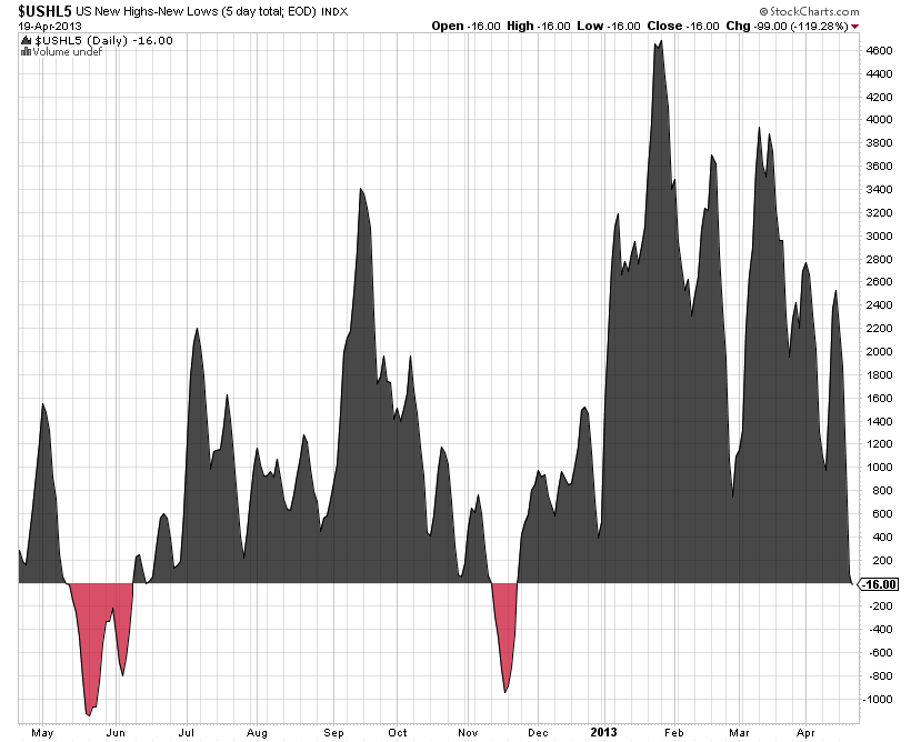 Attached is the New Highs / New Lows charts which had a quite negative week dropping below the zero line until Friday's recovery. However, the Total US 5 day total chart ended the week slightly in negative territory for the first time since November, and so is flashing a warning sign at least.