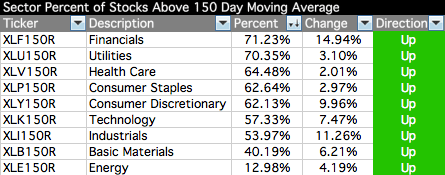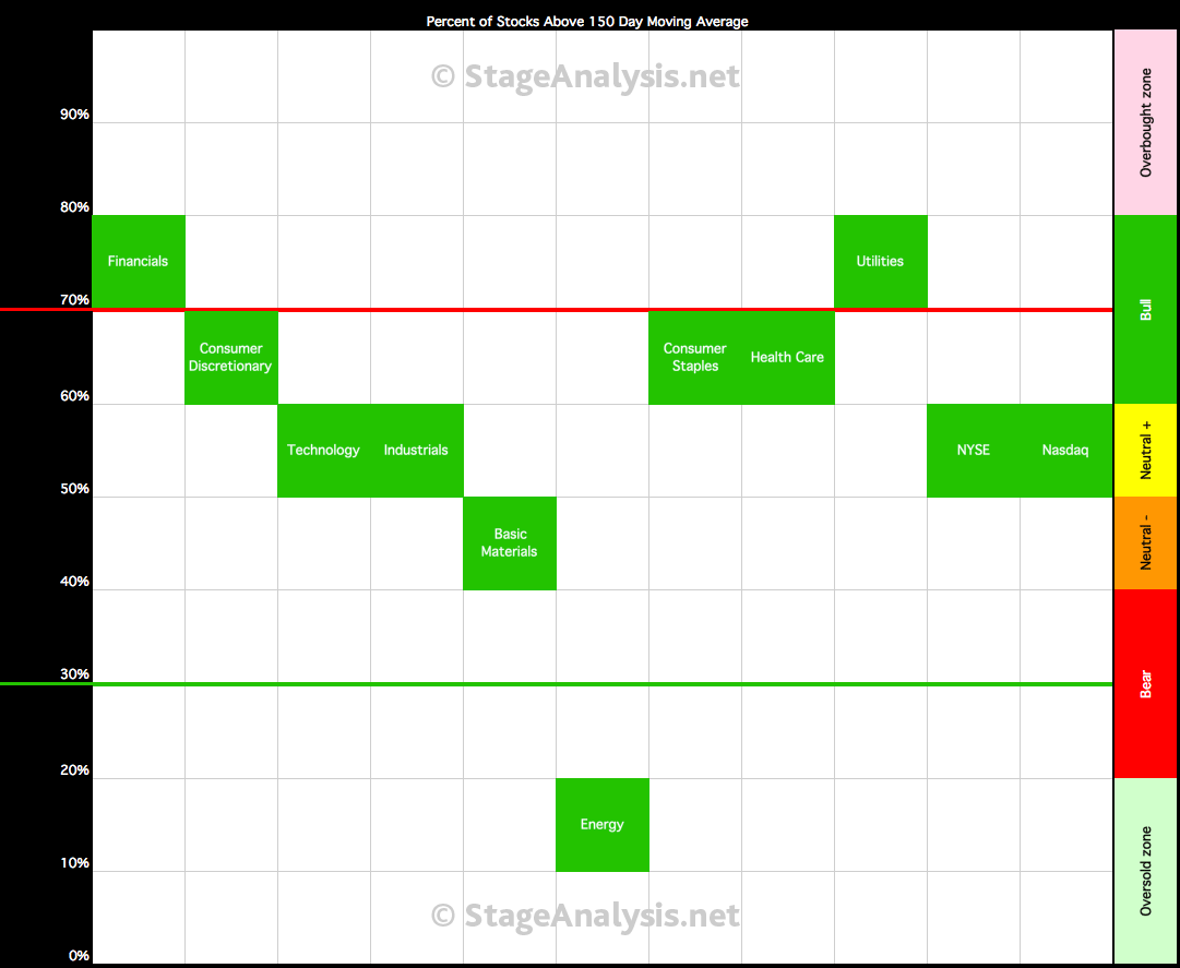 Below is the data table for the Percent of Stocks Above 150 Day Moving Average in each sector which I've ordered by relative strength, with the highest to the lowest percentage in each sector. Also attached is the visual diagram of the 9 sectors and the NYSE Percentage of Stocks above their 150 day Moving Averages line chart.