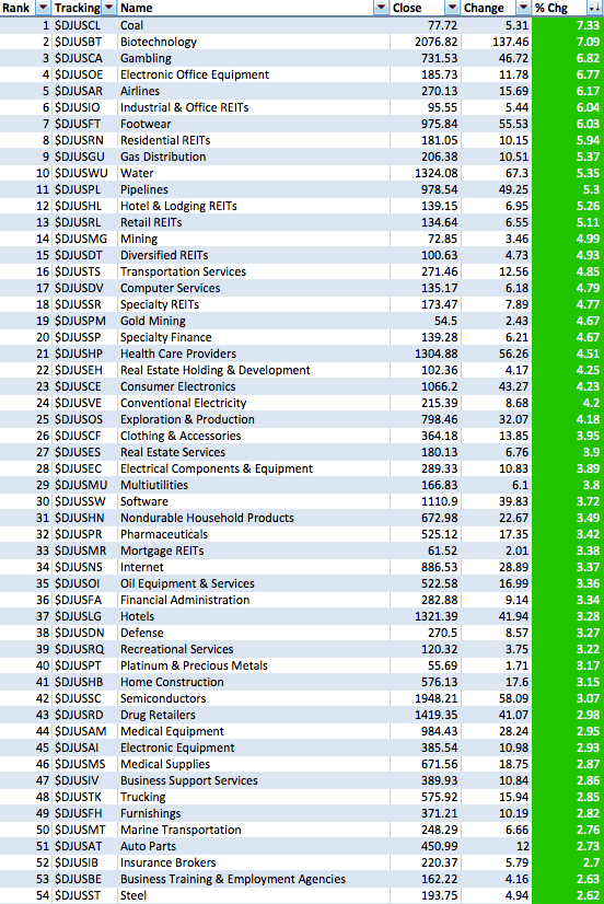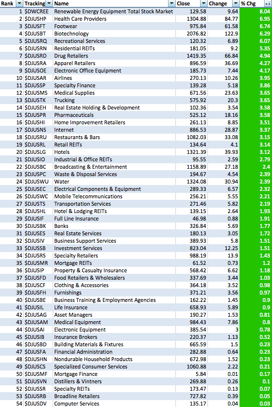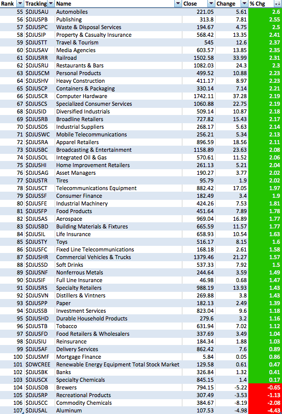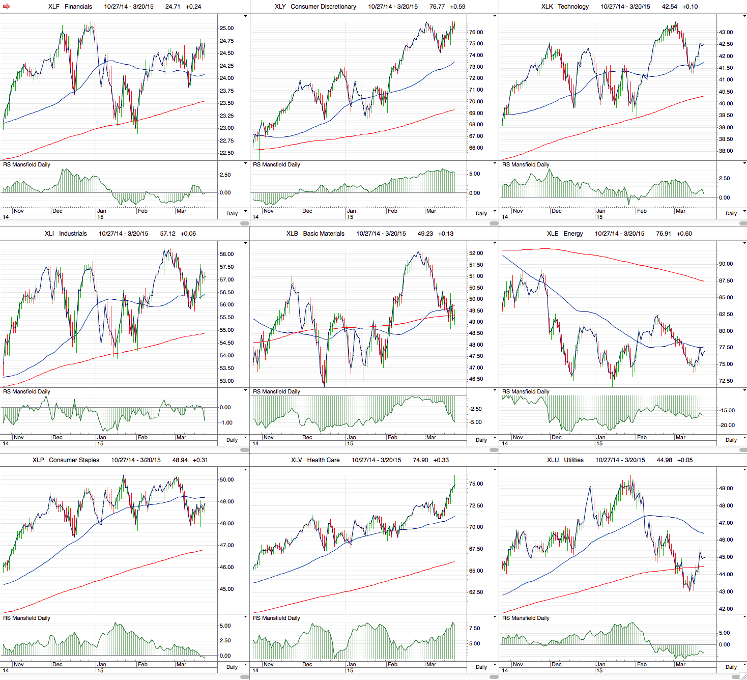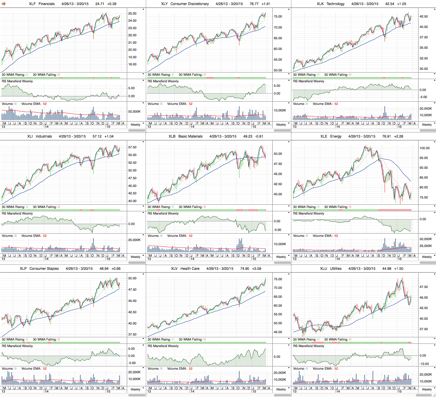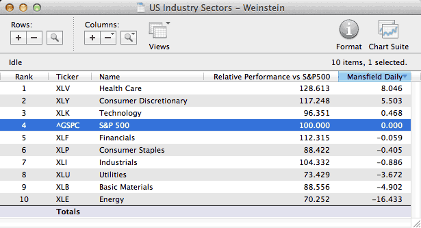 (2015-03-19, 12:52 AM)isatrader Wrote: One more thing is that the Percentage of Stocks above their 150 day MA's is a chart to determine the health of the market, whereas to see the relative performance versus the market of the major sectors, then you need to view the Mansfield RS table that I post in the Stan Weinstein thread, as that uses the Mansfield readings that we use to determine relative performance in Weinstein's method with the Mansfield zero line.