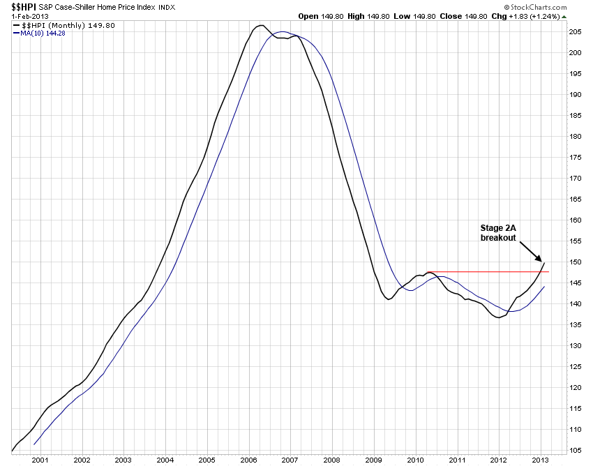 I thought it would be interesting to add some Economic Indicators to the market breadth set that I look at on here as they give an alternate insight into the market moves. They are monthly datasets, and tend to lag, but look to have a good correlation especially on the long term trends. So attached is the 20 year US Non-Farm Payrolls chart, the 13 year S&P Case-Shiller Home Price Index chart and the 20 year US Unemployment Rate chart. The Case-Shiller Home Price Index is just moving into Stage 2A for the first time since it topped out in 2006 which is a positive for housing in the US. Home builder stocks have obviously been anticipating this and have had huge moves over the last year or so, and so it will be interesting to see if the improving fundamental data in housing will help continue their Stage 2 runs.