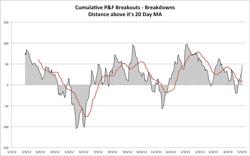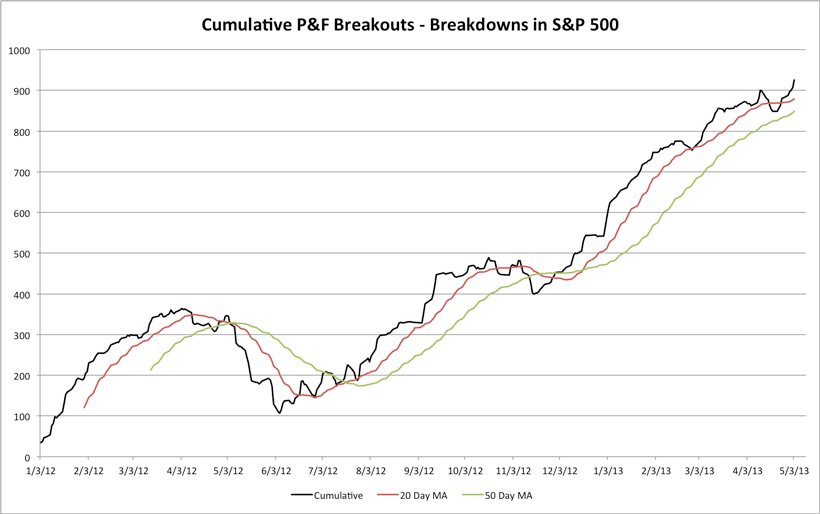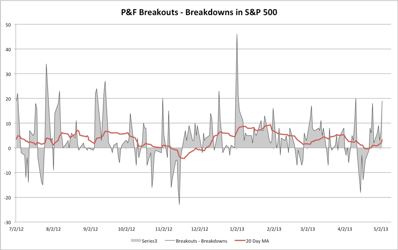 As I noted earlier in the week on the S&P 500 Daily breakouts and breakdowns thread, the S&P 500 Cumulative P&F Breakouts - Breakdowns chart broke out this week back above it's previous high and finished the week at new highs once more. There was a total of 51 breakouts and 7 breakdowns this week in the S&P 500. Attached is the updated charts.
