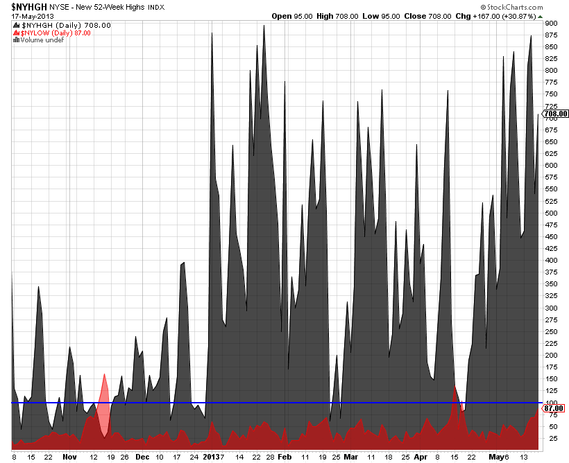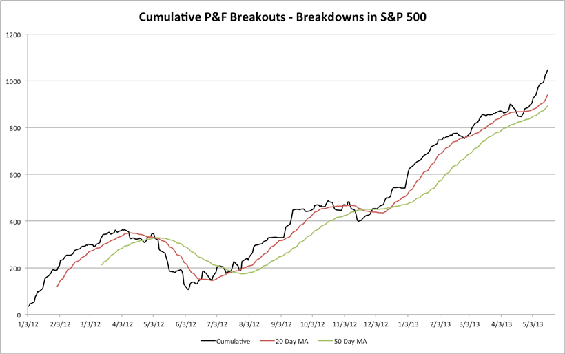 Another week, and another new high for the S&P 500 Cumulative P&F Breakouts - Breakdowns chart, which added a further +59 to it's total. Since the start of May there have been 163 P&F breakouts and only 13 P&F breakdowns in the S&P 500. So again there's still no let up in this bull move currently.