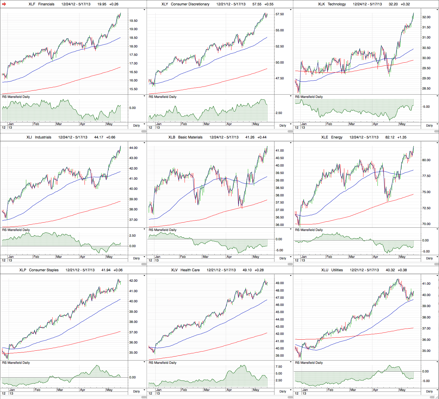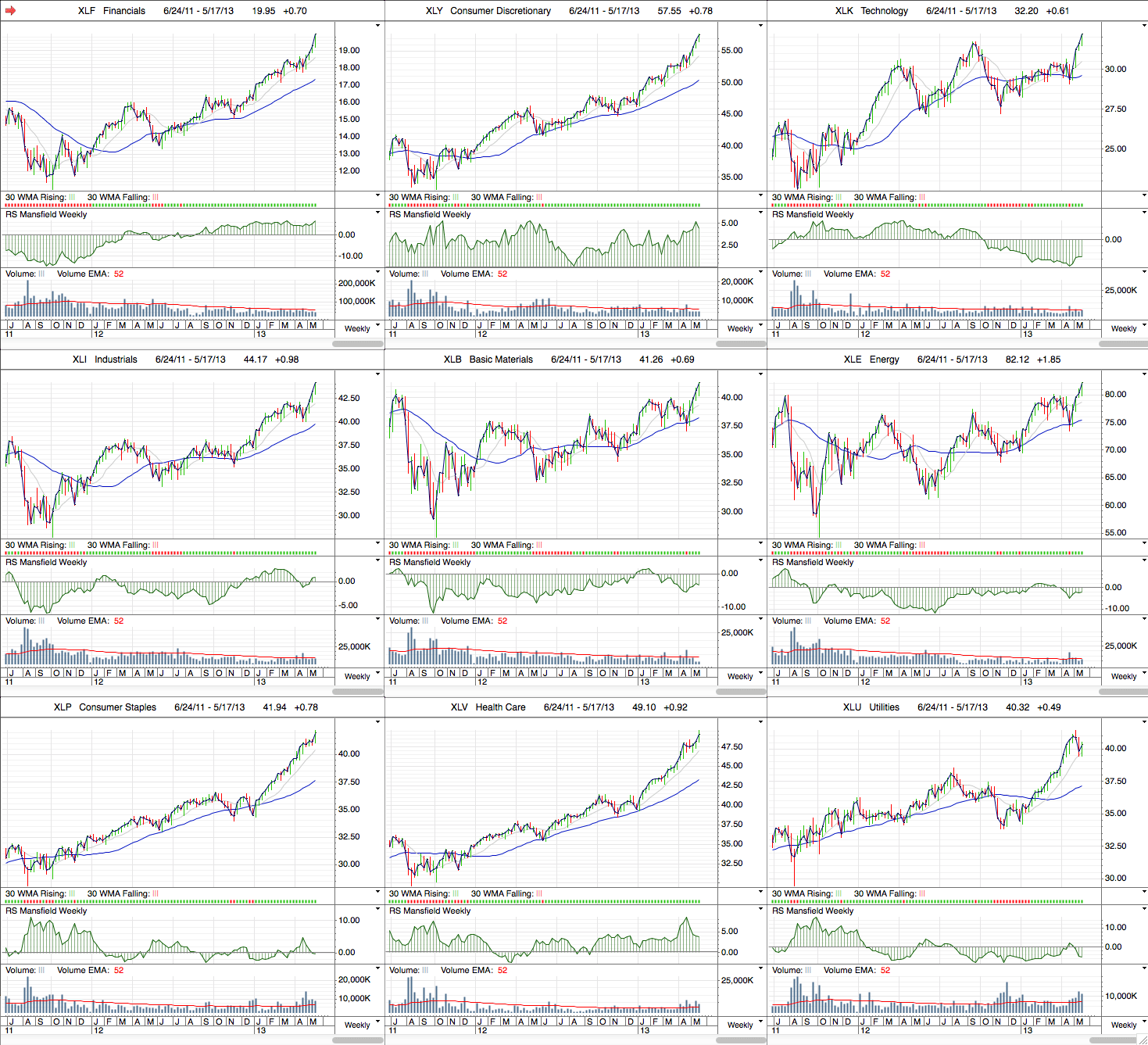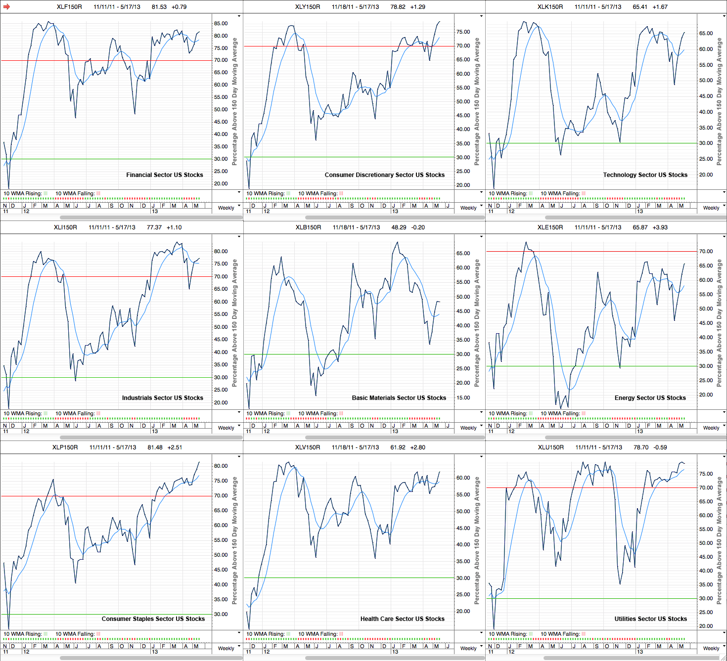 Well this is a picture I don't remember seeing before since I've been doing these sector updates. All sectors are currently on a buy signal and also had another positive week. The sector breadth visual diagram really captures it I think, as you can see the very bullish picture currently with all sectors with more than half there stocks above their 150 day moving averages.