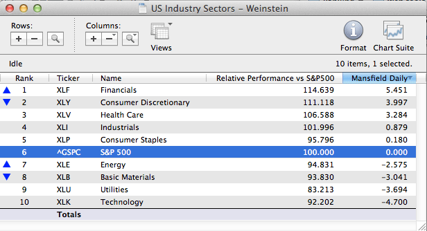 Attached are the updated US Industry Sector Charts and relative performance table. Financials (XLF) retakes the top spot from Consumer Discretionary (XLY), whereas Technology, although recovering, is still bottom of the RS table currently. But it has been making a strong come back the last month and so could start to move back up the table finally in the coming weeks after a long time at the bottom.