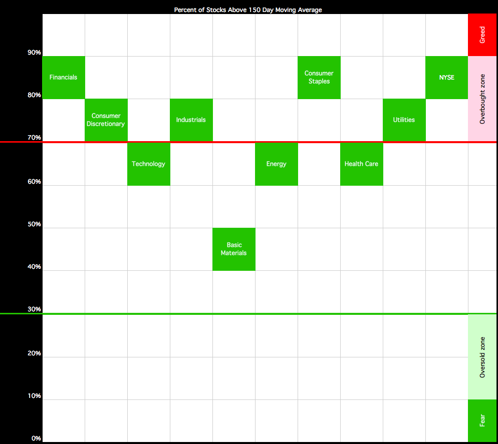 Below is the data table for the Percent of Stocks Above 150 Day Moving Average in each sector which I've ordered by relative strength, with the highest to the lowest percentage in each sector. Also attached is the visual diagram of the 9 sectors and the overall NYSE Percentage of Stocks above their 150 day Moving Averages, plus the 1% P&F chart and line chart of the nine sectors.