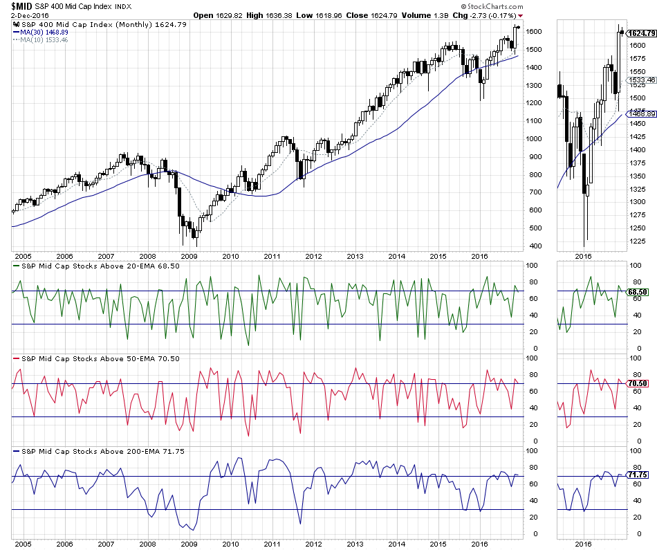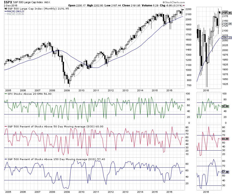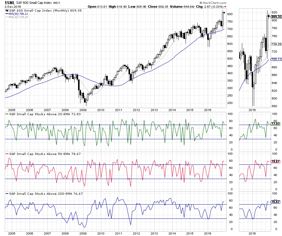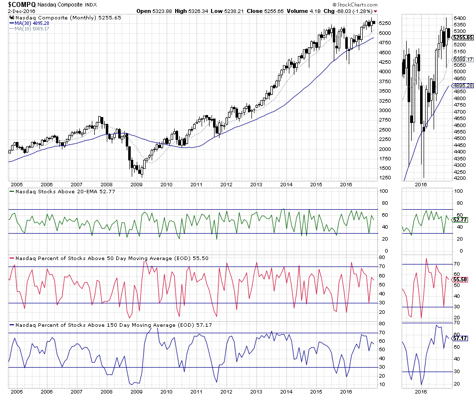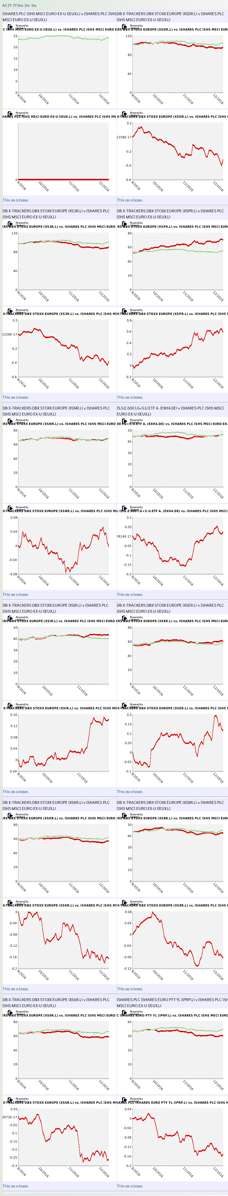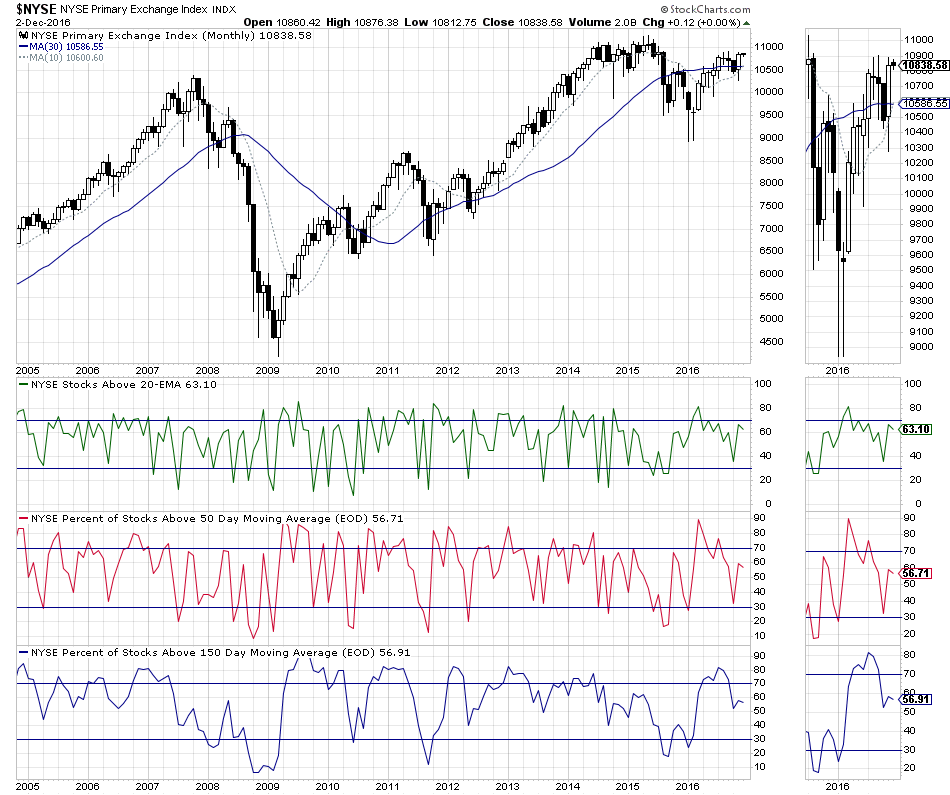RE: Stan Weinstein's Stage Analysis(2016-11-29, 04:58 AM)diaz Wrote:(2016-11-26, 03:27 PM)pcabc Wrote: Relative strength charts, countries, US and Europe. They contain two plots per sector. For example for the US I'm using sector ETFs against (by default) the Wilshire 5000 index. So I plot the sector ETF and a (scaled) version of the W5000 to match. Below that I plot a relative strength graph which is the sector ETF divided by the W5000. My latest thoughts are that an appropriate period is three months. If the relative strength graph is rising then the EFT is stronger than the W5000. RE: Stan Weinstein's Stage Analysis(2016-11-30, 09:02 PM)pcabc Wrote:Pcabc - just a suggestion if you could stretch the Y-axis to give a little more definition I think that would help, charts seems squished on the Y. Also as a personal preference I would drop the shadow the data lines have as I feel it takes away from readability. thanks(2016-11-29, 04:58 AM)diaz Wrote:(2016-11-26, 03:27 PM)pcabc Wrote: Relative strength charts, countries, US and Europe. RE: Stan Weinstein's Stage Analysis(2016-12-01, 02:39 PM)Smellypunks Wrote: Pcabc - just a suggestion if you could stretch the Y-axis to give a little more definition I think that would help, charts seems squished on the Y. Also as a personal preference I would drop the shadow the data lines have as I feel it takes away from readability. thanks Feedback appreciated. I've made the Y axis taller for the RS part of the plot for next time. Unfortunately though I have no control over the formatting of the charts apart from the line colour owing to the charting library I'm using. I've had thoughts of reworking this in a similar fashion to my main charts for a while, but I need to get some time to do so. One thing that is missing from these charts is the interactive feature I have on my computer, as I can select any sector as the 'base' reference for the RS plots. Therefore if I pick a sector that looks strong as the base then it is clear if it is strong as all the other RS charts will slope downward. Thought about plotting a matrix of thumbnail charts so that everything is plotted against everything else, but if you have one base index and eight sectors that gives you a 9x9 matrix which would only be workable for those with excellent eyesight and huge monitors. Also not good for file sizes. I'll have to think of a cunning plan. Monthly Charts - US Stock Indexes - NYSE, Nasdaq, S&P 500, Mid Caps and Small Caps