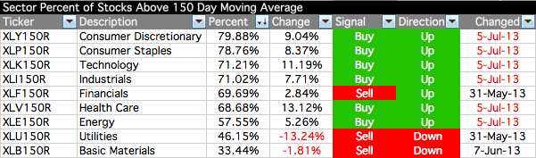 Below is the data table for the Percent of Stocks Above 150 Day Moving Average in each sector which I've ordered by relative strength, with the highest to the lowest percentage in each sector. Also attached is the visual diagram of the 9 sectors and the NYSE Percentage of Stocks above their 150 day Moving Averages line chart.