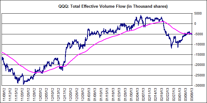 Attached is the updated Effective Volume charts from http://www.effectivevolume.com of the SPY, QQQ and IWM ETFs, which shows a negative divergence with the price action this week, as the large player volume has stayed fairly flat around the 20 day MA and not made new highs like the indexes have.