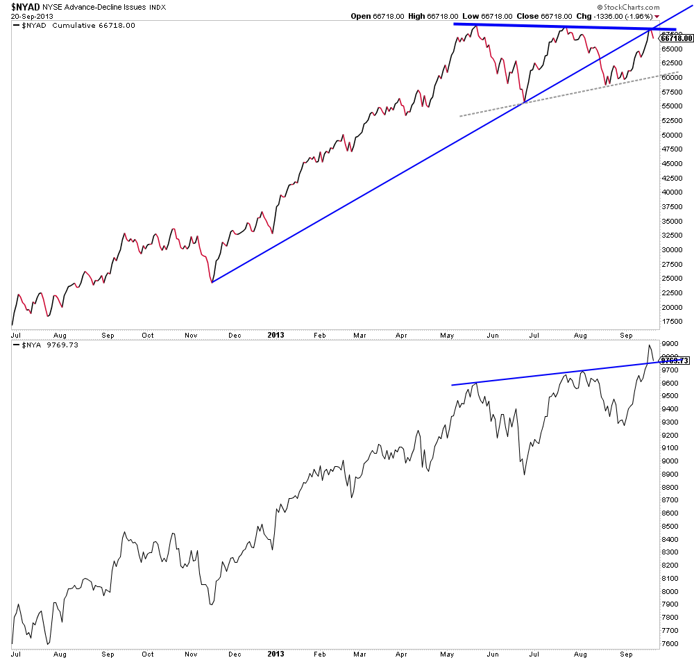 Not liking this chart. Broken trend line, backtest at 2 resistance points, and non-confirmation of our new highs!