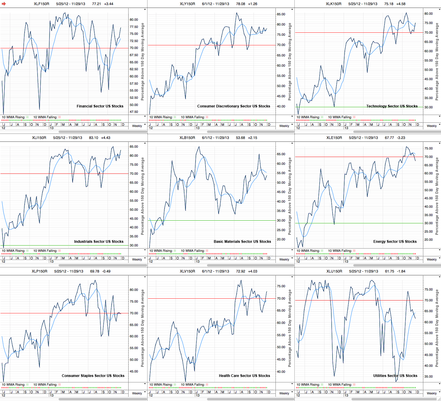 Below is the data table for the Percent of Stocks Above 150 Day Moving Average in each sector which I've ordered by relative strength, with the highest to the lowest percentage in each sector. Also attached is the visual diagram of the 9 sectors and the NYSE Percentage of Stocks above their 150 day Moving Averages line chart.